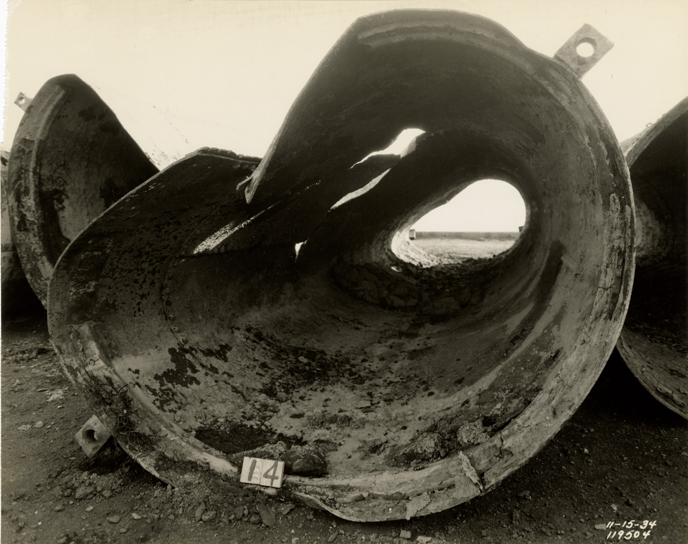View of no. 3 intake pipes, Detroit water supply system. Printed on front: "11-15-34." Stamped on back: "Manning Bros., commercial photographers. 504-505 Lincoln Building. Corner State and Park Sts., Detroit, Mich." Typed on back: "No. 3 intake removed November 1934, contract RC-27, was constructed in 1890. Length no. 14, counting from outer end toward shore, as viewed from its outer, or southerly end. Distortion and lacerations are on upper surface of pipe, toward upstream or easterly side, and probably due to stranding of steamer Conneaut on August 10, 1932. Bolt lugs establish horizontal axis in its original position on river bottom."