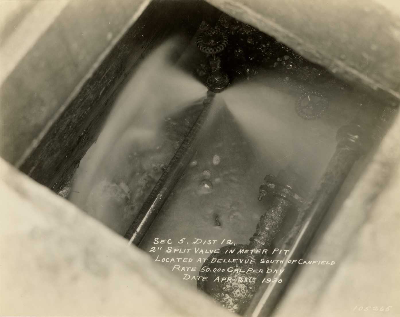 Split valve in meter pit on Bellevue Avenue south of Canfield, Detroit water supply system