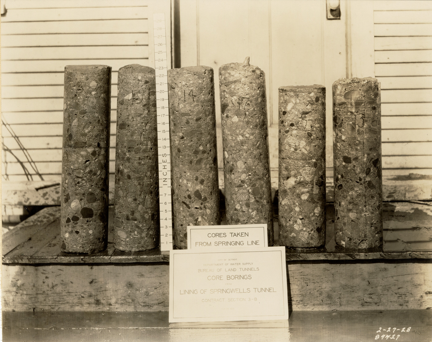 View of cores taken from Springwells tunnel, Detroit water supply system." Sign in foreground reads: "Cores taken from springing line. City of Detroit. Department of Water Supply. Bureau of Land Tunnels. Core borings from lining of Springwells tunnel. Contract section 3-B." Printed on front: "2-27-28."
