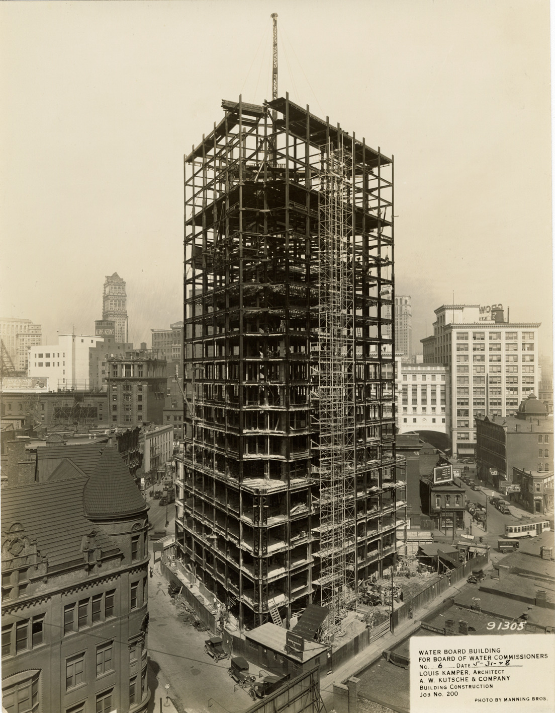 View of Water Board building during construction, Detroit water supply system. Printed on front: "Water Board building for Board of Water Commissioners. No. 6. Date: 5-31-28. Louis Kamper, architect. A.W. Kutsche & Company. Building construction. Job no. 200. Photo by Manning Bros."