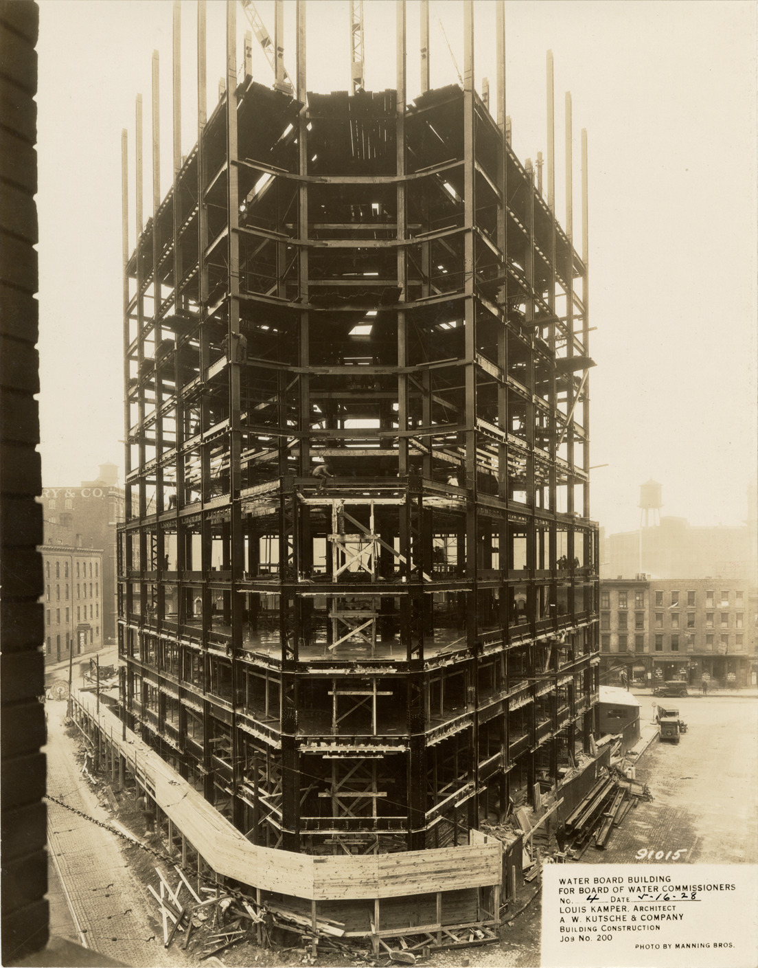 View of Water Board building during construction, Detroit water supply system. Printed on front: "Water Board building for Board of Water Commissioners. No. 4. Date: 5-16-28. Louis Kamper, architect. A.W. Kutsche & Company. Building construction. Job no. 200. Photo by Manning Bros."