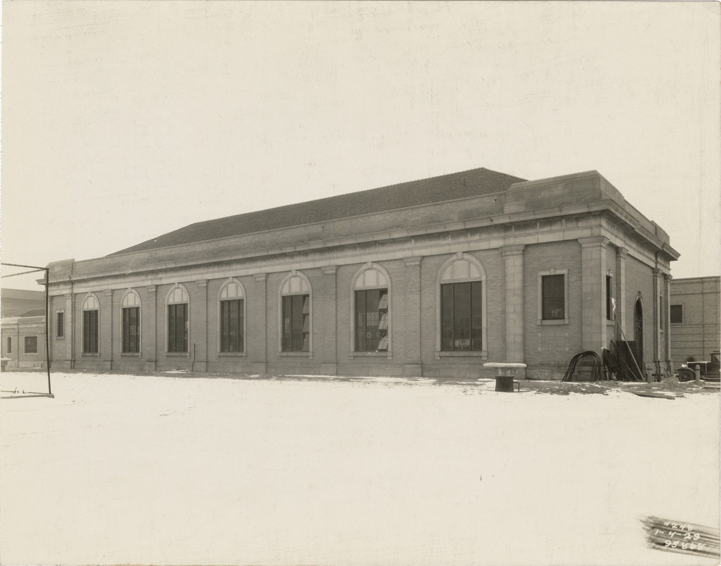 View of pumping station at Waterworks Park, Detroit water supply system. Printed on front: "1-4-29." Stamped on back: "Manning Bros., commercial photographers. 504-505 Lincoln Building. Corner State and Park Sts., Detroit, Mich."