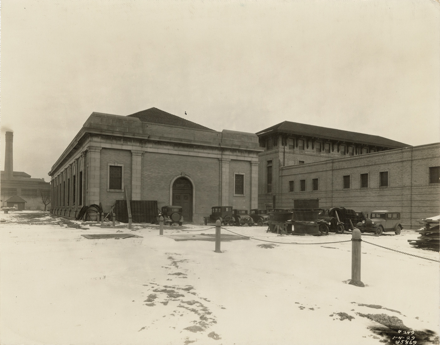 View of cars parked in front of pumping station at Waterworks Park, Detroit water supply system. Printed on front: "1-4-29." Stamped on back: "Manning Bros., commercial photographers. 504-505 Lincoln Building. Corner State and Park Sts., Detroit, Mich."