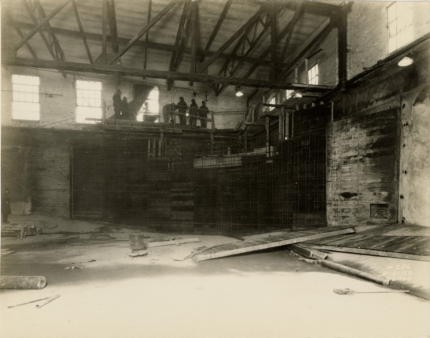 View of buttresses, forms and reinforcing steel for overflow weir at Waterworks Park, Detroit water supply system. Printed on front: "2-1-29." Stamped on back: "Manning Bros., commercial photographers. 504-505 Lincoln Building. Corner State and Park Sts., Detroit, Mich." Handwritten on back: "View showing completed buttresses, forms and reinforcing steel for overflow weir."