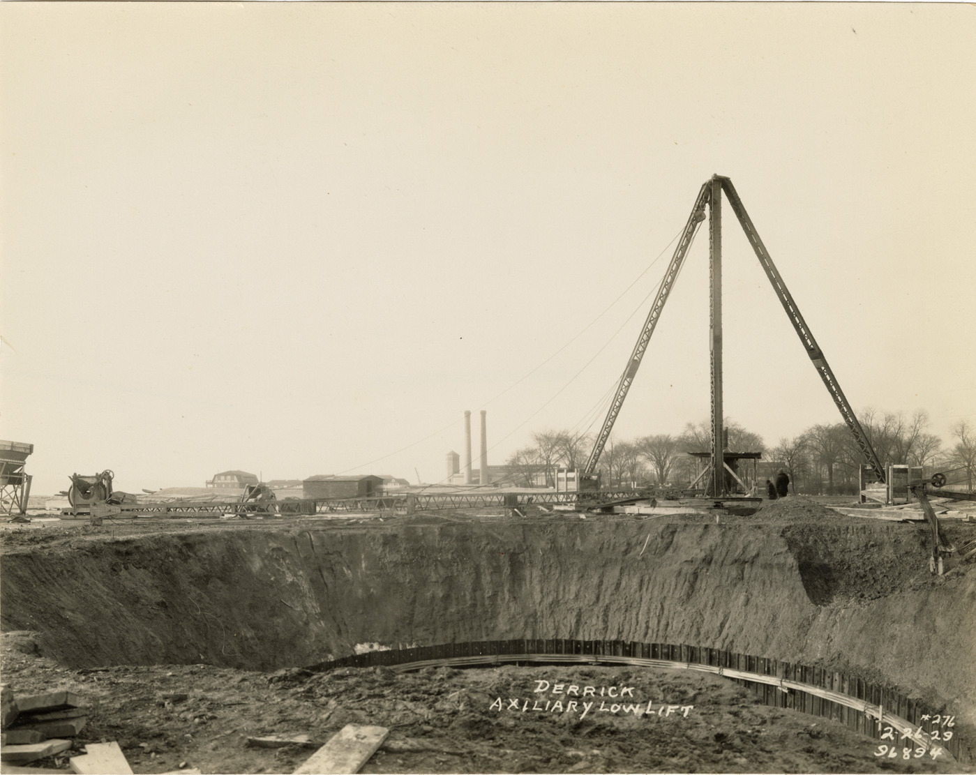 View of derrick next to pump pit, auxiliary low lift plant, Waterworks Park, Detroit water supply system. Printed on front: "Derrick, auxiliary low lift. 2-26-29." Stamped on back: "Manning Bros., commercial photographers. 504-505 Lincoln Building. Corner State and Park Sts., Detroit, Mich."