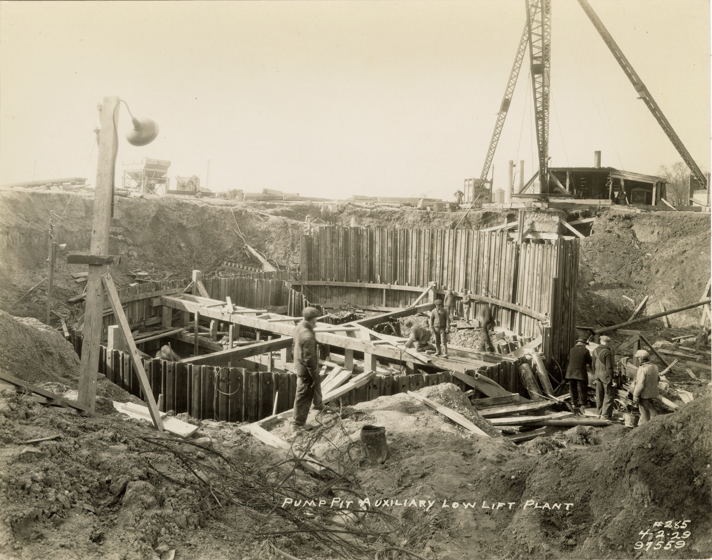 View of steel sheet piling around pump pit, auxiliary low lift plant, Waterworks Park, Detroit water supply system. Workers in foreground. Printed on front: "Pump pit, auxiliary low lift plant. 4-2-29." Stamped on back: "Manning Bros., commercial photographers. 504-505 Lincoln Building. Corner State and Park Sts., Detroit, Mich."
