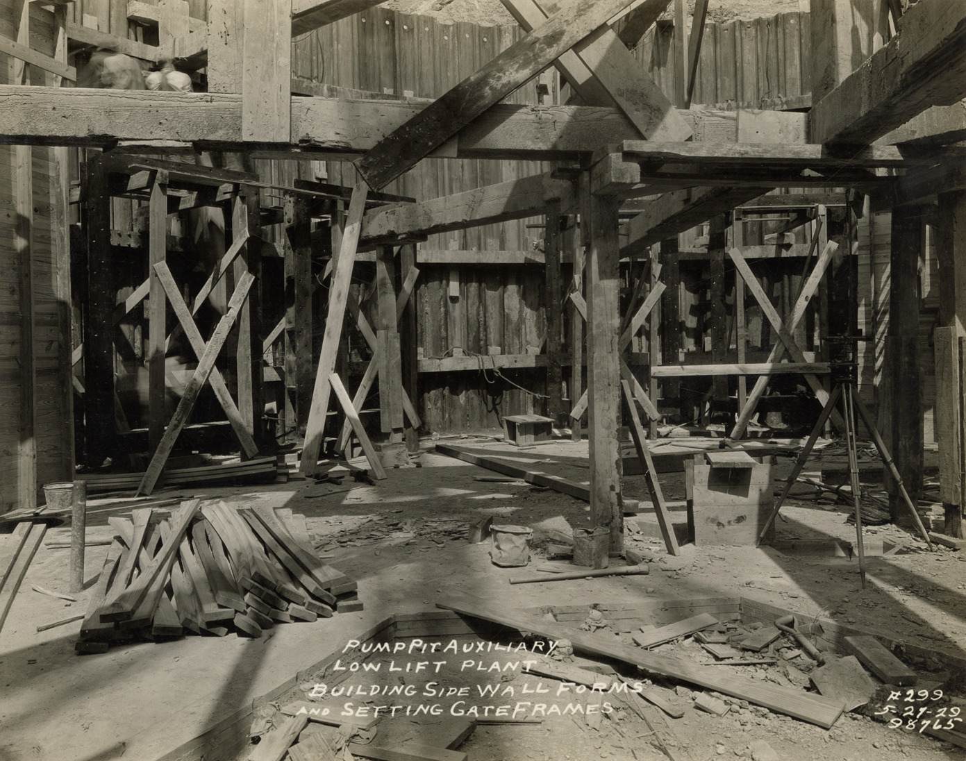 View of side wall forms and gate frames in pump pit during construction, auxiliary low lift plant, Waterworks Park, Detroit water supply system. Printed on front: "Pump pit. Auxiliary low lift plant. Building side wall forms and setting gate frames. 5-27-29."