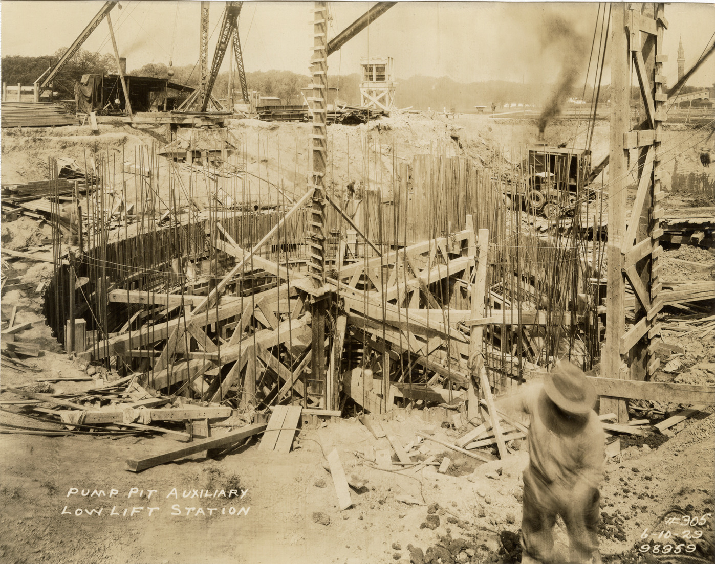 View of pump pit during construction, auxiliary low lift plant, Waterworks Park, Detroit water supply system. Printed on front: "Pump pit, auxiliary low lift station. 6-10-29." Stamped on back: "Manning Bros., commercial photographers. 504-505 Lincoln Building. Corner State and Park Sts., Detroit, Mich."