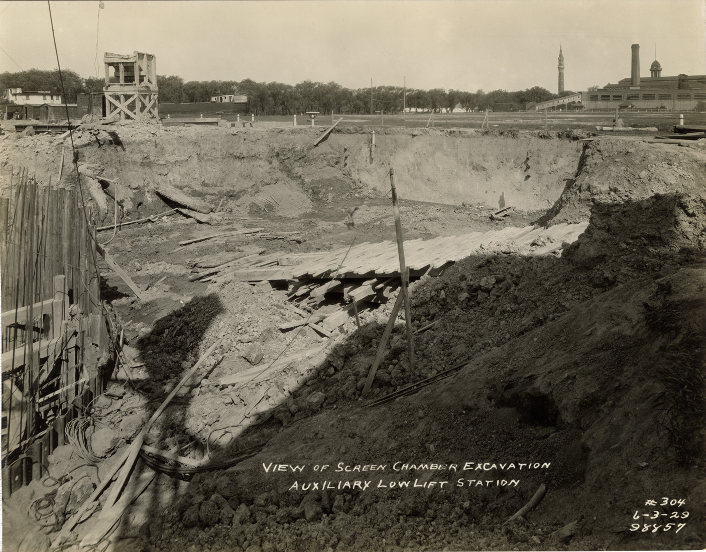 View of excavation of screen chamber, auxiliary low lift plant, Waterworks Park, Detroit water supply system. Printed on front: "View of screen chamber excavation. Auxiliary low lift station. 6-3-29." Stamped on back: "Manning Bros., commercial photographers. 504-505 Lincoln Building. Corner State and Park Sts., Detroit, Mich."