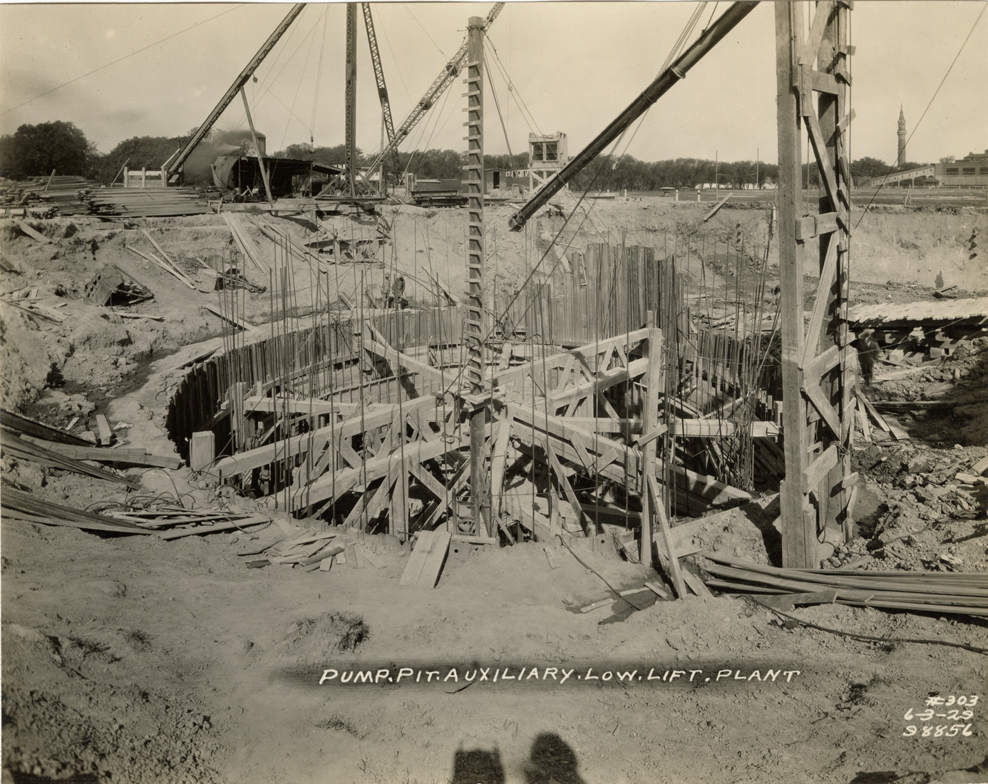 View of pump pit during construction, auxiliary low lift plant, Waterworks Park, Detroit water supply system. Printed on front: "Pump pit, auxiliary low lift plant. 6-3-29." Stamped on back: "Manning Bros., commercial photographers. 504-505 Lincoln Building. Corner State and Park Sts., Detroit, Mich."