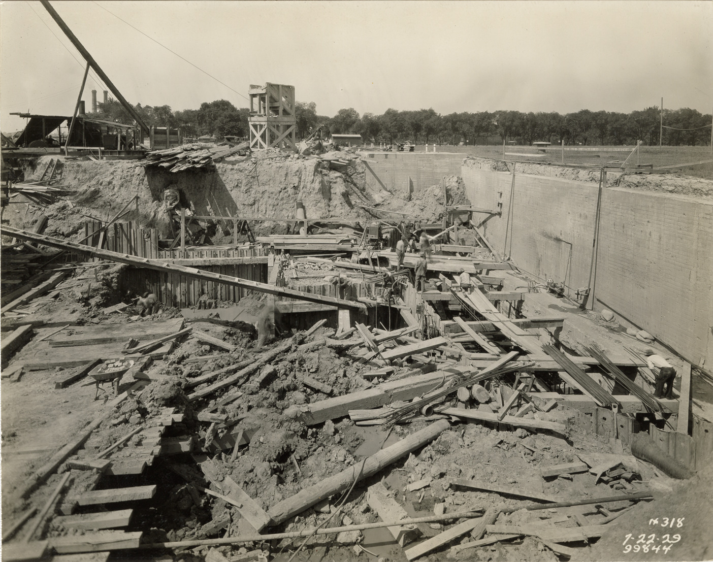 Workers placing steel for connecting chamber foundation slab, Waterworks Park, Detroit water supply system