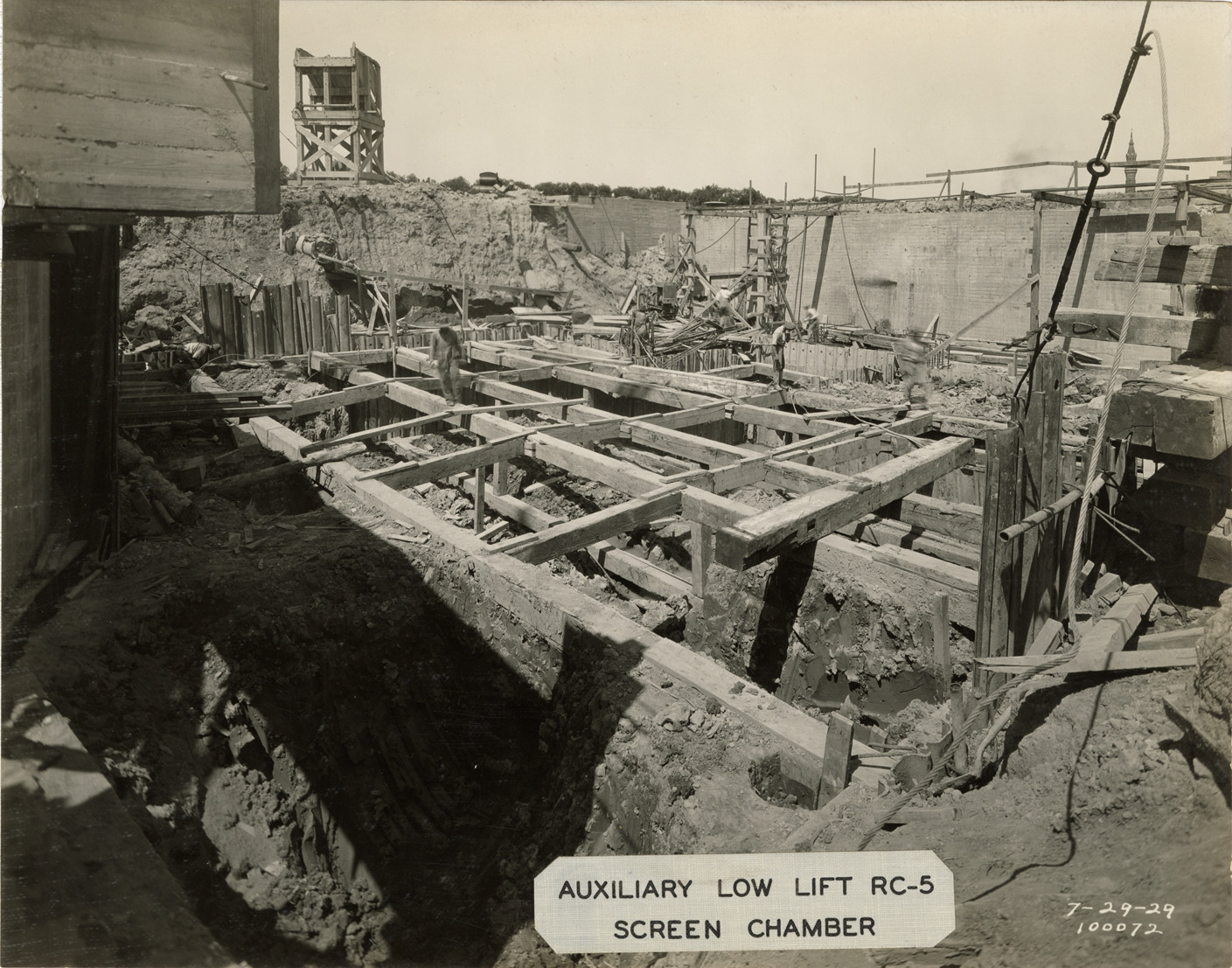 View of workers constructing screen chamber for auxiliary low lift plant, Waterworks Park, Detroit water supply system. Printed on front: "Auxiliary low lift, RC-5. Screen chamber. 7-29-29." Stamped on back: "Manning Bros., commercial photographers. 504-505 Lincoln Building. Corner State and Park Sts., Detroit, Mich."