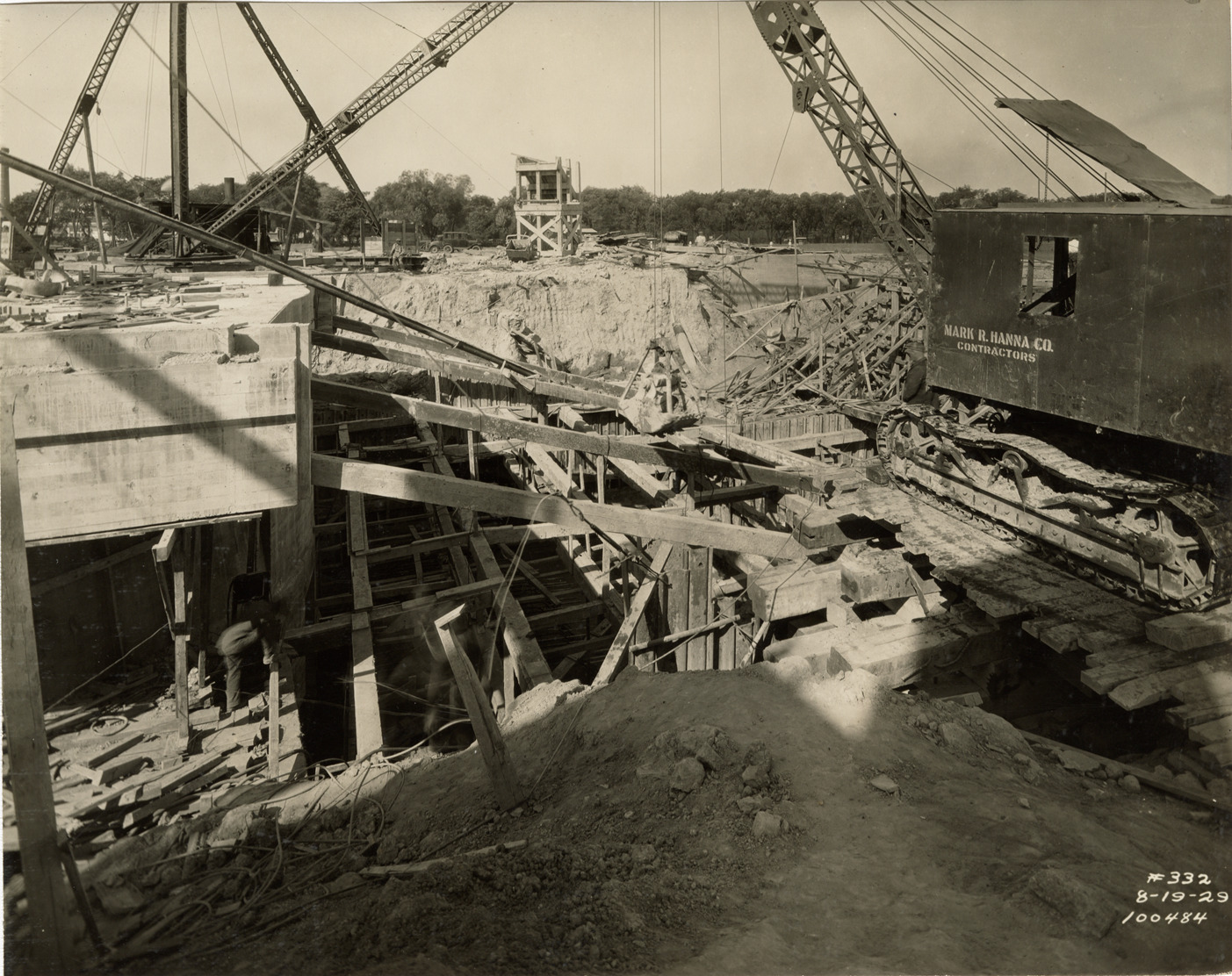 View of excavation for screen chamber, auxiliary low lift plant, Waterworks Park, Detroit water supply system. Crane on right. Printed on front: "8-19-29." Stamped on back: "Manning Bros., commercial photographers. 504-505 Lincoln Building. Corner State and Park Sts., Detroit, Mich." Typed on back: "Auxiliary low lift plant. Contract RC-5, substructure. Excavation for screen chamber. Pump pit at left."