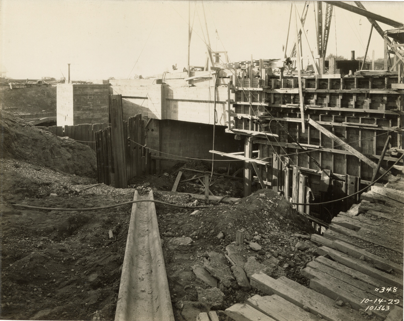 View of pump pit and screen chamber during construction, auxiliary low lift plant, Waterworks Park, Detroit water supply system. Printed on front: "10-14-29." Stamped on back: "Manning Bros., commercial photographers. 504-505 Lincoln Building. Corner State and Park Sts., Detroit, Mich." Typed on back: "Water Works Park Station. Auxiliary low lift plant substructure. RC-5. Pump pit (at left) and screen chamber (at right), wall forms in place, looking west."