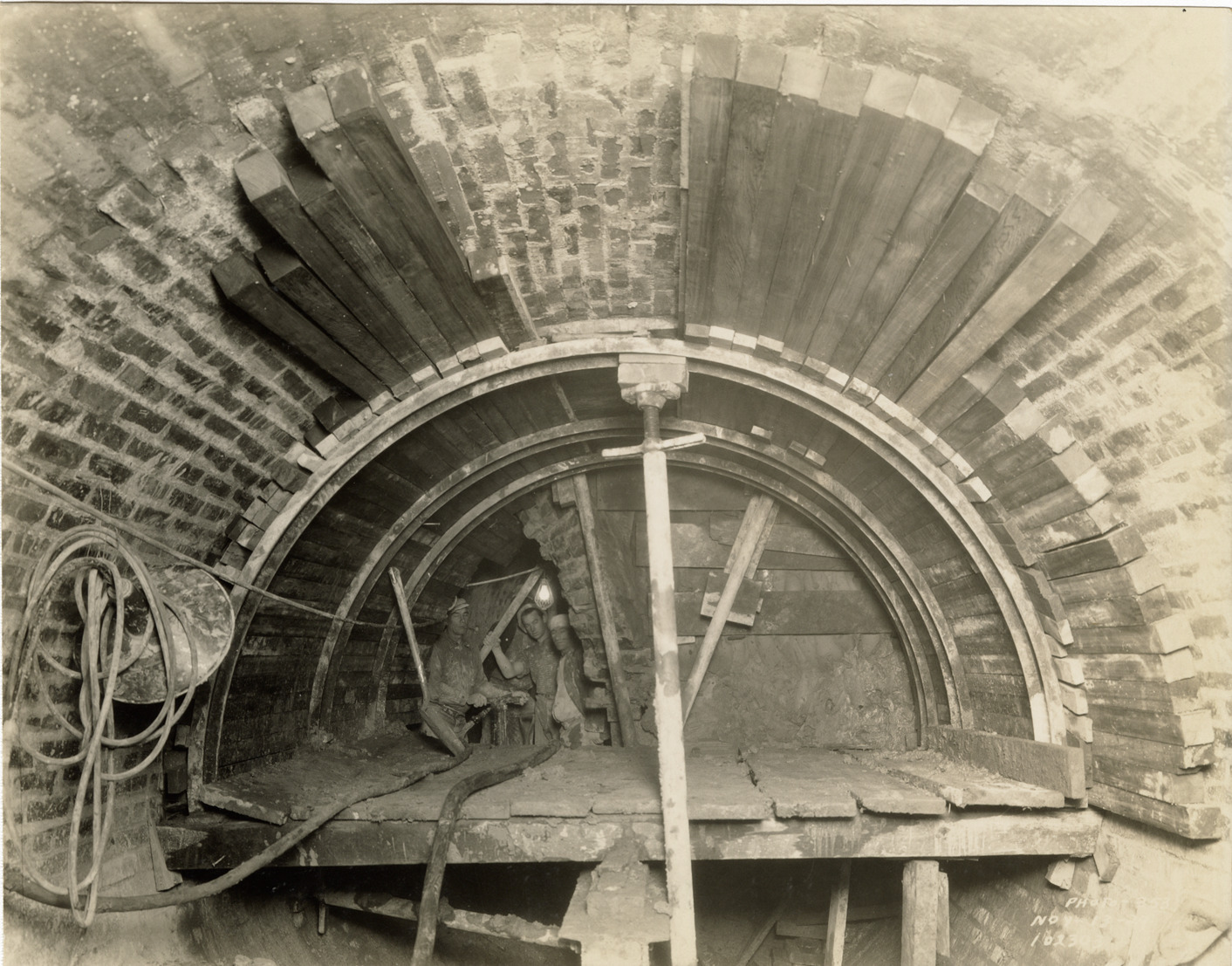 View of workers in tunnel, auxiliary low lift plant, Waterworks Park, Detroit water supply system. Printed on front: "Nov-13-29." Stamped on back: "Manning Bros., commercial photographers. 504-505 Lincoln Building. Corner State and Park Sts., Detroit, Mich." Typed on back: "Water Works Park Station. Auxiliary low lift plant. Substructure, Contract RC-5. 10-ft. tunnel connecting pump pit with junction well no. 6."