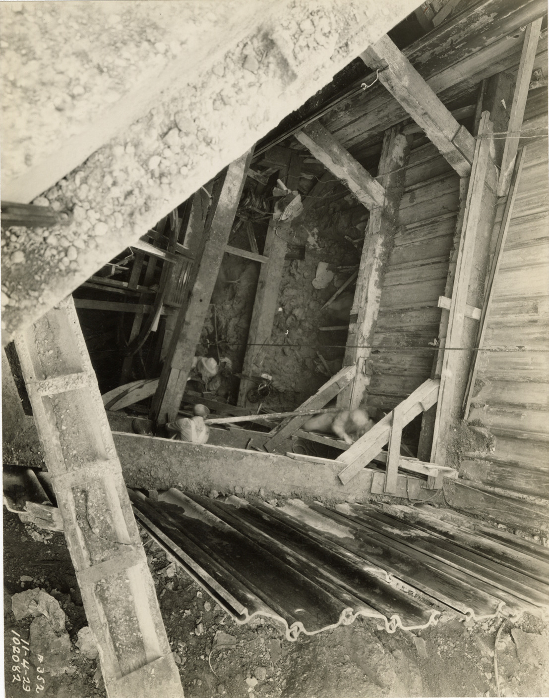 View of excavation for bellmouth, auxiliary low lift plant, Waterworks Park, Detroit water supply system. Printed on front: "11-4-29." Stamped on back: "Manning Bros., commercial photographers. 504-505 Lincoln Building. Corner State and Park Sts., Detroit, Mich." Typed on back: "Water Works Park Station. Auxiliary low lift plant. Substructure, Contract RC-5. Excavation for north-east bellmouth."