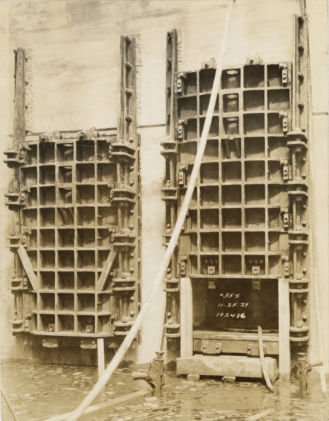 Sluice gates in pump pit, auxiliary low lift plant, Waterworks Park, Detroit water supply system