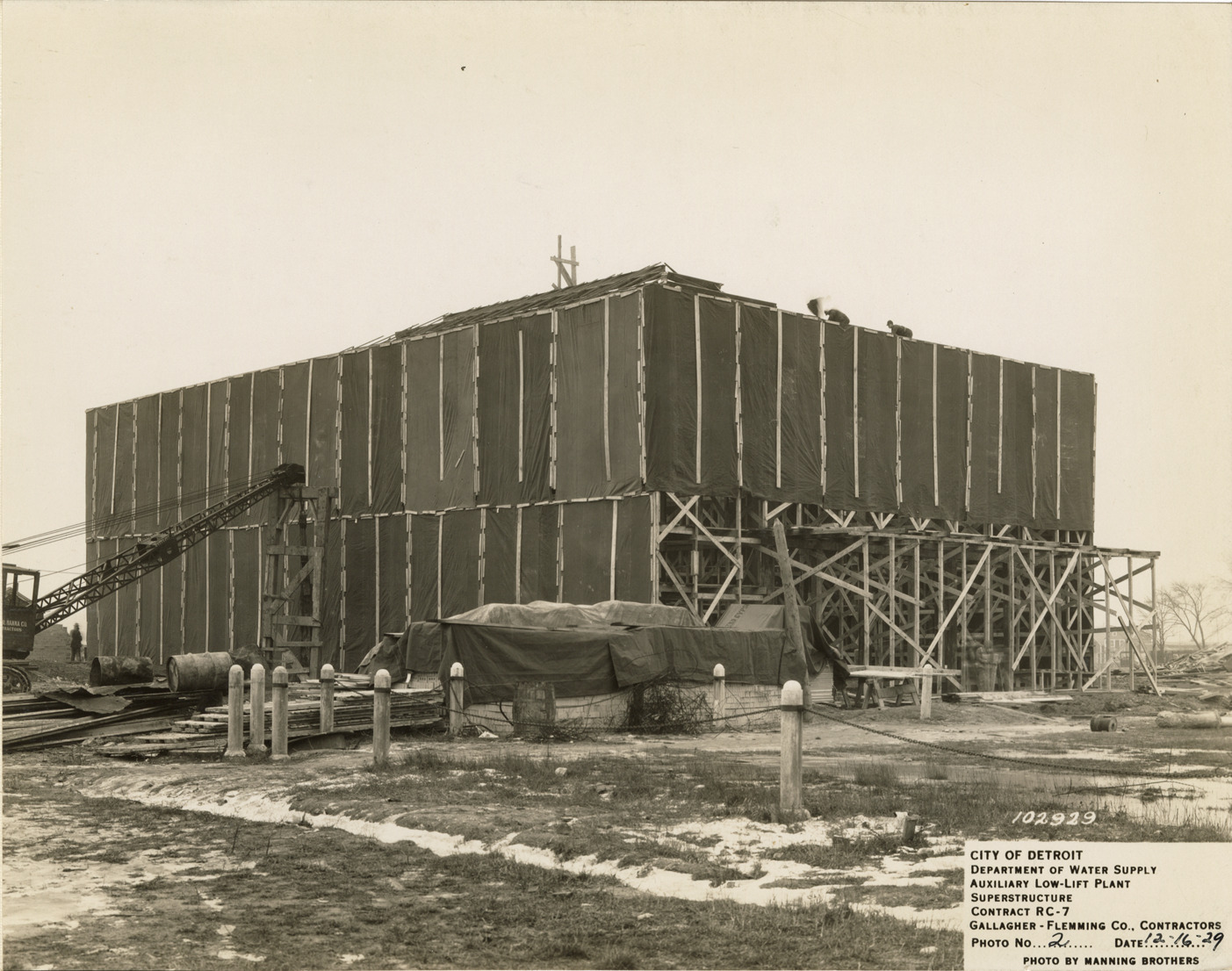 View of cold weather protective enclosure, auxiliary low lift plant, Waterworks Park, Detroit water supply system. Printed on front: "City of Detroit. Department of Water Supply. Water Works Park. Auxiliary low lift plant superstructure. Contract RC-7. Gallagher-Flemming Co., contractors. No. 2. Date: 12-16-29. Photo by Manning Bros." Stamped on back: "Manning Bros., commercial photographers. 504-505 Lincoln Building. Corner State and Park Sts., Detroit, Mich." Typed on back: "Erecting enclosure for protection of work against cold weather."