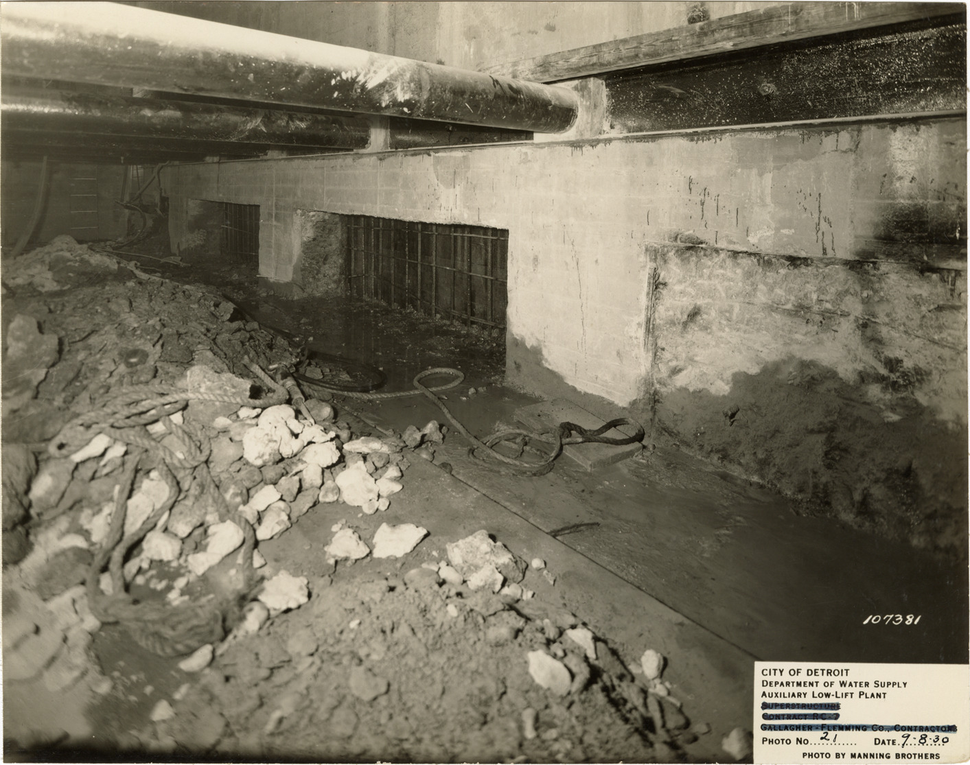 View of connection chamber during construction, auxiliary low lift plant, Waterworks Park, Detroit water supply system. Printed on front: "City of Detroit. Department of Water Supply. Auxiliary low lift plant. Photo no. 21. Date: 9-8-30. Photo by Manning Bros." Stamped on back: "Manning Bros., commercial photographers. 504-505 Lincoln Building. Corner State and Park Sts., Detroit, Mich." Typed on back: "Connection chamber: cutting openings in south wall of reservoir no. 1 for delivering raw water through the reservoir in an emergency. Timber bulkheads placed over a year and a half ago keep out water while cutting. Bulkheads to be removed later. Note pipe struts bracing reservoir wall against wall of connection chamber."