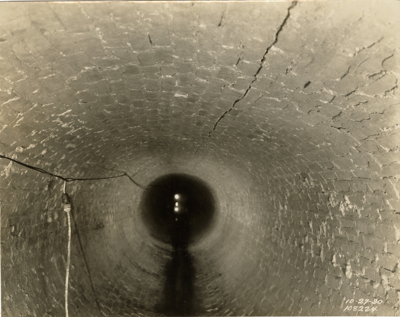 View of brick tunnel, auxiliary low lift plant, Waterworks Park, Detroit water supply system. Printed on front: "10-27-30." Stamped on back: "Manning Bros., commercial photographers. 504-505 Lincoln Building. Corner State and Park Sts., Detroit, Mich." Typed on back: "Making temporary repairs to 10 ft. brick tunnel feeding low lift pumping plant."