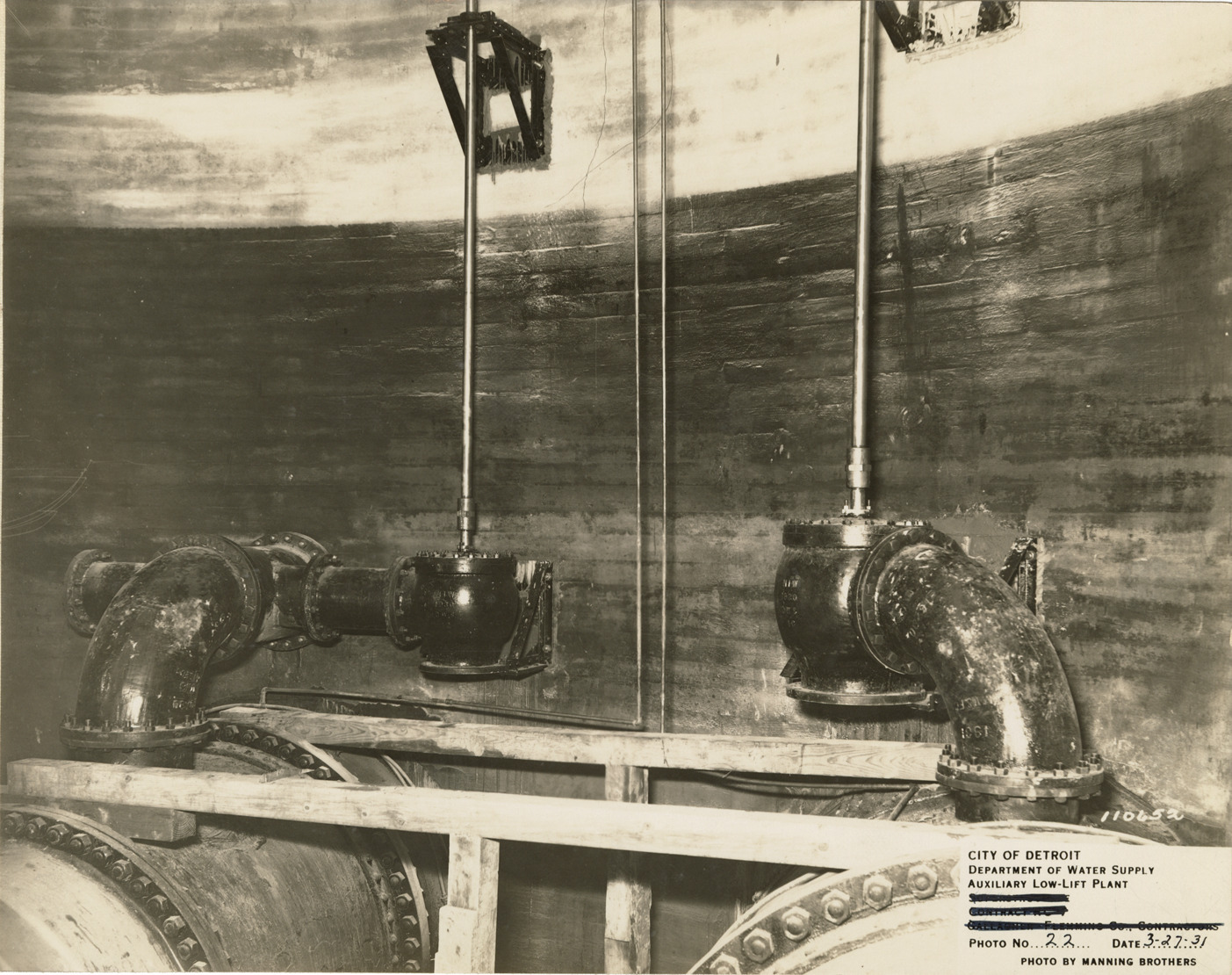 View of bleeder valves in pump pit, auxiliary low lift plant, Waterworks Park, Detroit water supply system. Printed on front: "City of Detroit. Department of Water Supply. Auxiliary low lift plant. Photo no. 22. Date: 3-27-31. Photo by Manning Bros." Stamped on back: "Manning Bros., commercial photographers. 504-505 Lincoln Building. Corner State and Park Sts., Detroit, Mich." Typed on back: "View of pump pit, showing 12 inch bleeder valve on left and 16 inch bleeder valve on right."