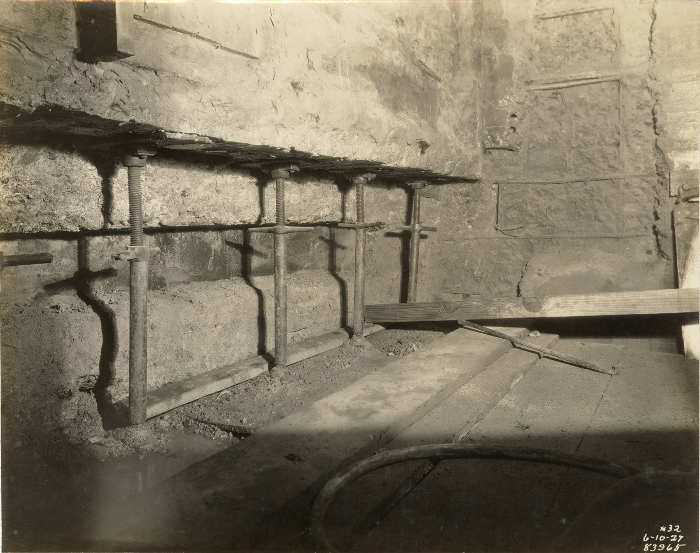 View of wall supports, auxiliary low lift plant, Waterworks Park, Detroit water supply system. Printed on front: "6-10-27." Stamped on back: "Manning Bros., commercial photographers. 504-505 Lincoln Building. Corner State and Park Sts., Detroit, Mich."