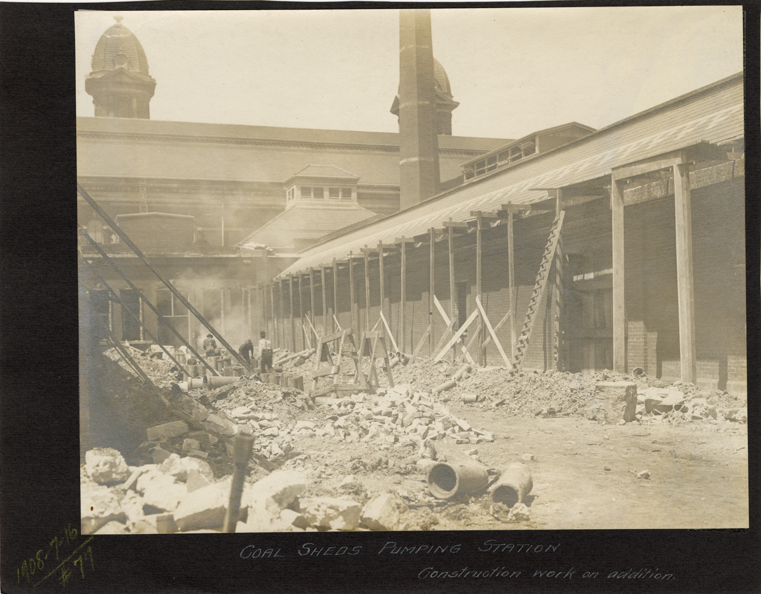 View of coal sheds for pumping station at Waterworks Park, Detroit water supply system. Handwritten on front: "Coal sheds, pumping station. Construction work on addition. 1908-7-16."
