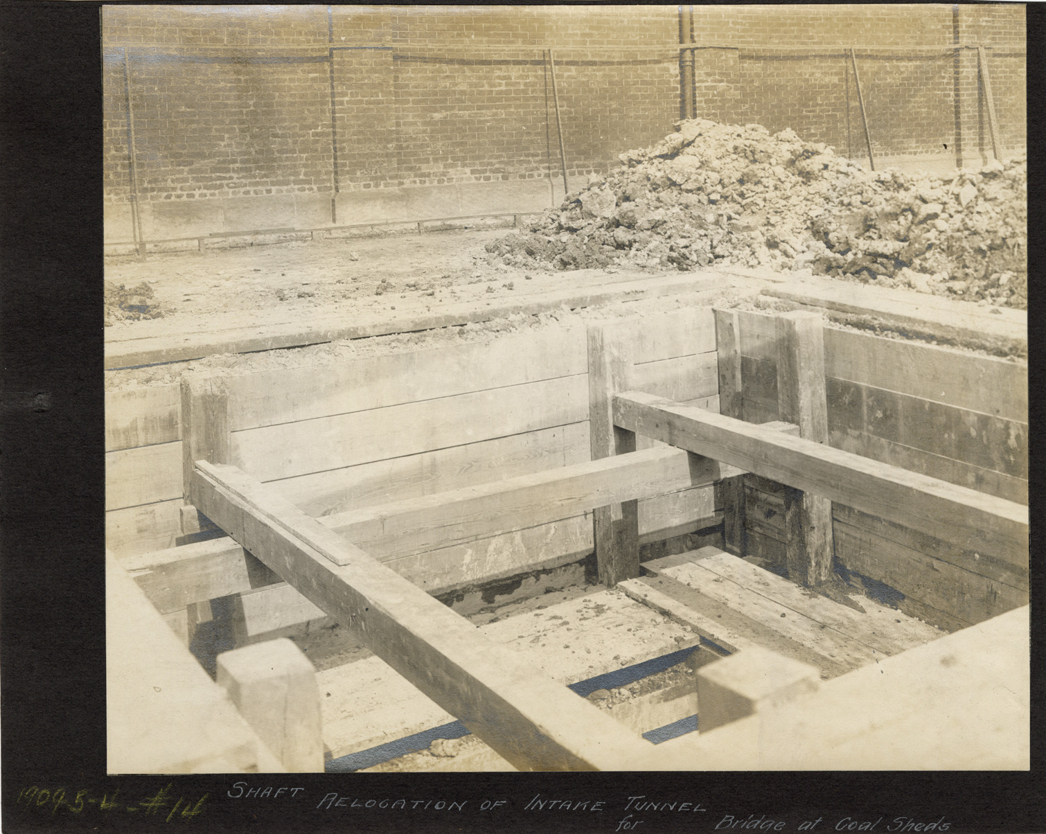 View of shaft relocation of intake tunnel for bridge at coal sheds, Waterworks Park, Detroit water supply system. Handwritten on front: "Shaft relocation of intake tunnel for bridge at coal sheds. 1909-5-4."