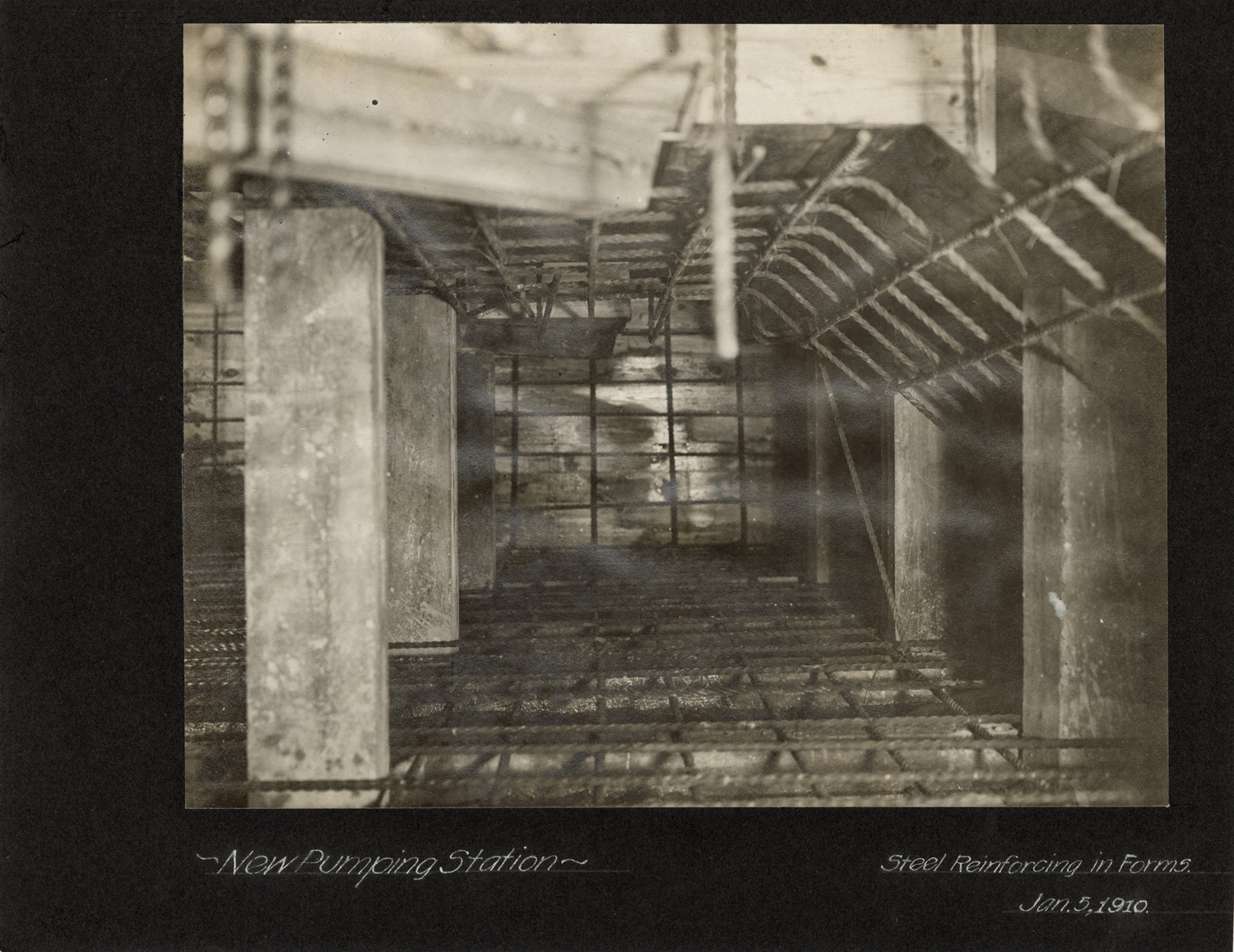 View of steel reinforcing in forms, pumping station, Waterworks Park, Detroit water supply system. Handwritten on front: "New pumping station. Steel reinforcing in forms. Jan. 5, 1910."
