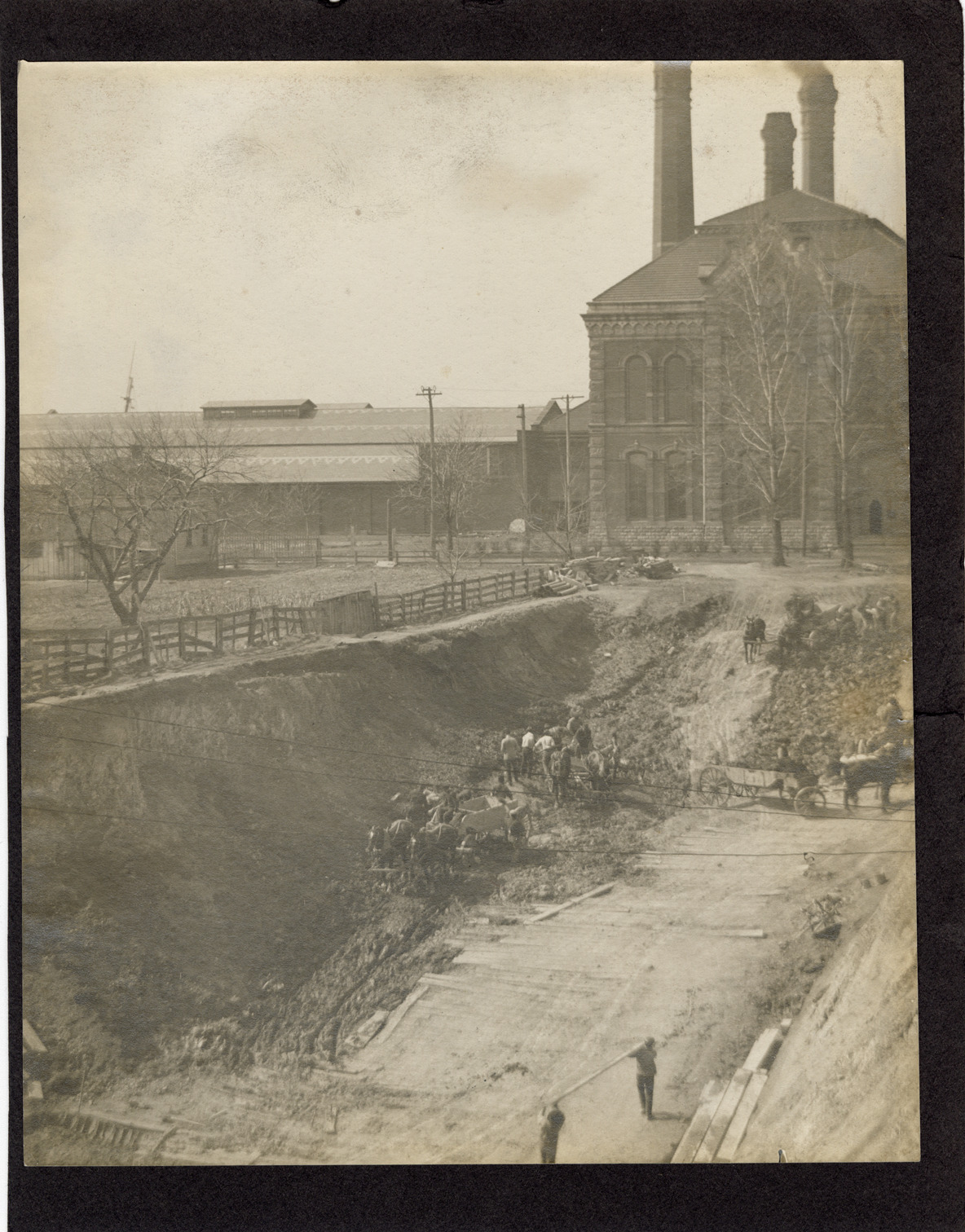 View of excavation site at Waterworks Park, Detroit water supply system. Workers and horse-drawn wagons on site; buildings in background. Label accompanying photos: "The Board of Water Commissioners. Buildings. Work under construction and miscellaneous pictures. Photographs taken and bound by Civil Engineering Department. 1910."