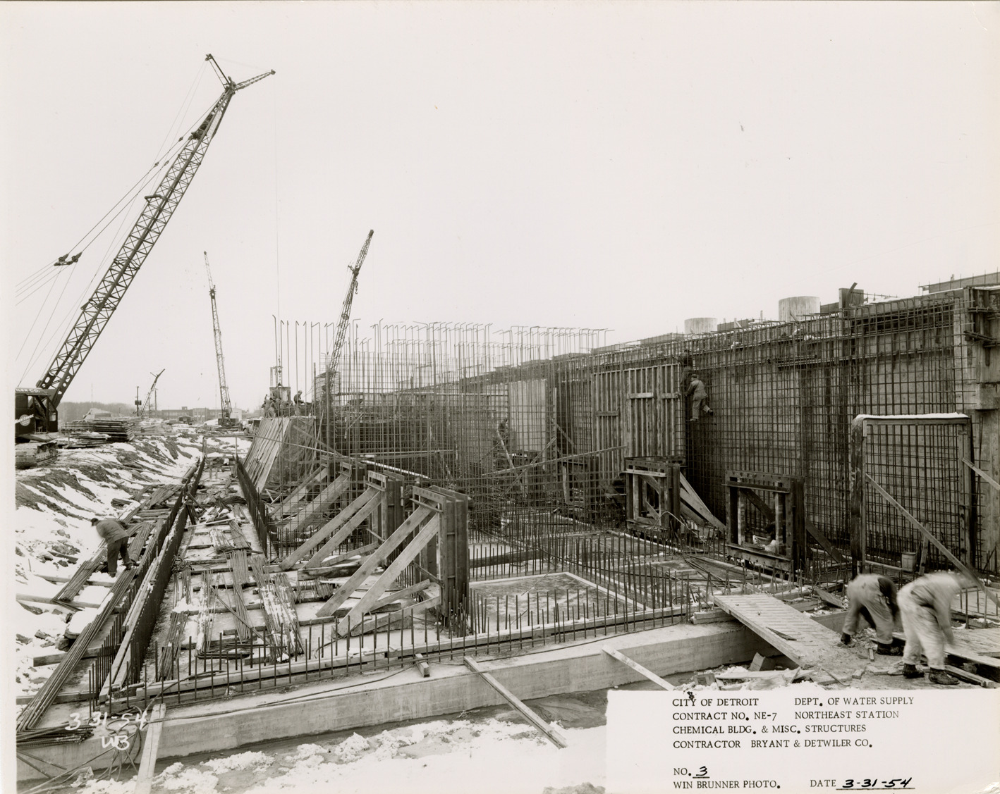 View of Chemical Building during construction, Northeast Station, Detroit water supply system. Printed on front: "City of Detroit. Department of Water Supply. Contract no. NE-7. Northeast Station. Chemical Bldg. & misc. structures. Contractor Bryant & Detwiler Co. No. 3. Win Brunner photo. Date: 3-31-54." Typed on back: "No. 3. Chemical Building, looking northeast."