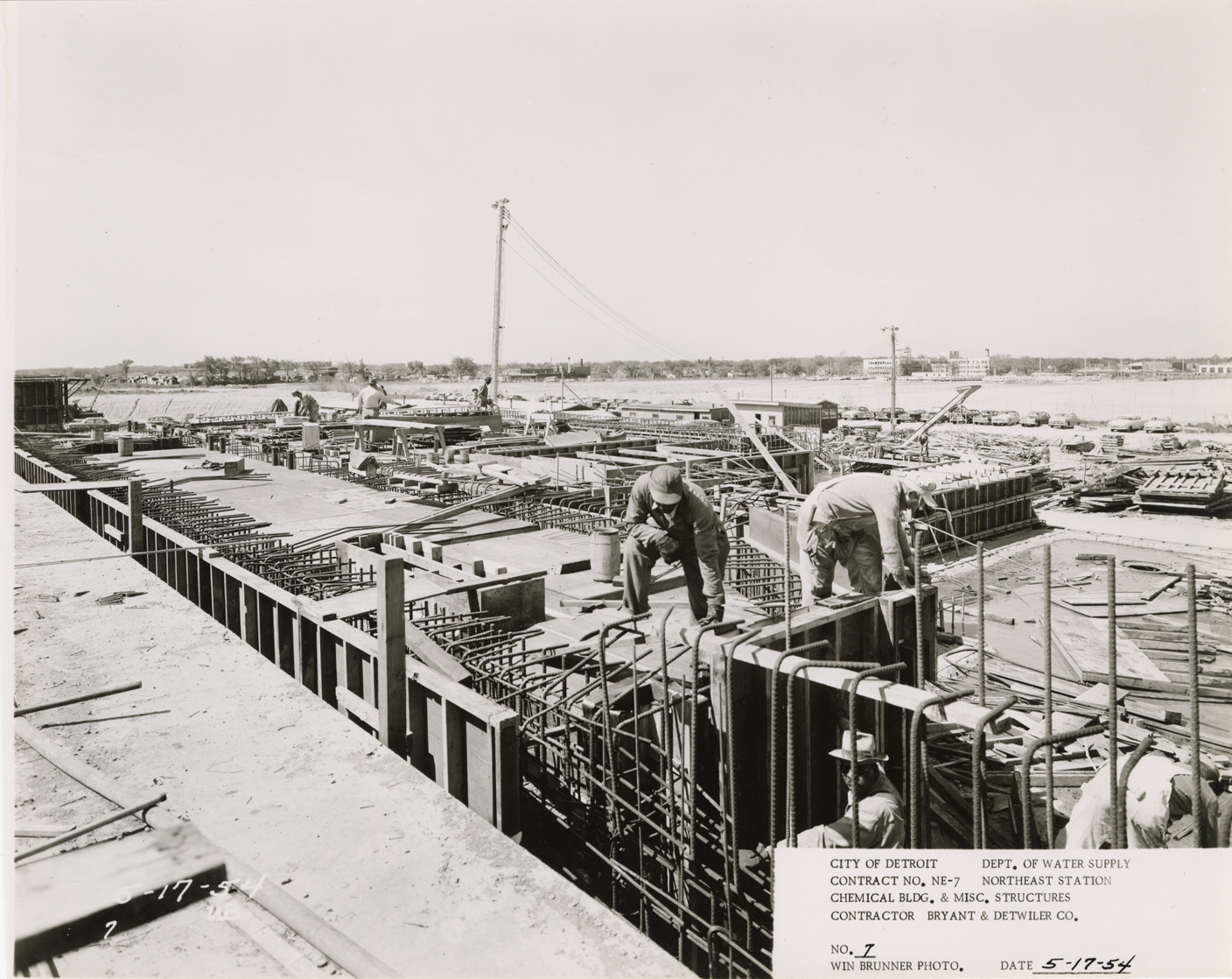 View of Chemical Building during construction, Northeast Station, Detroit water supply system. Workers in foreground. Printed on front: "City of Detroit. Department of Water Supply. Contract no. NE-7. Northeast Station. Chemical Bldg. & misc. structures. Contractor Bryant & Detwiler Co. No. 7. Win Brunner photo. Date: 5-17-54." Typed on back: "No. 7. South end of Chemical Building from northeast."