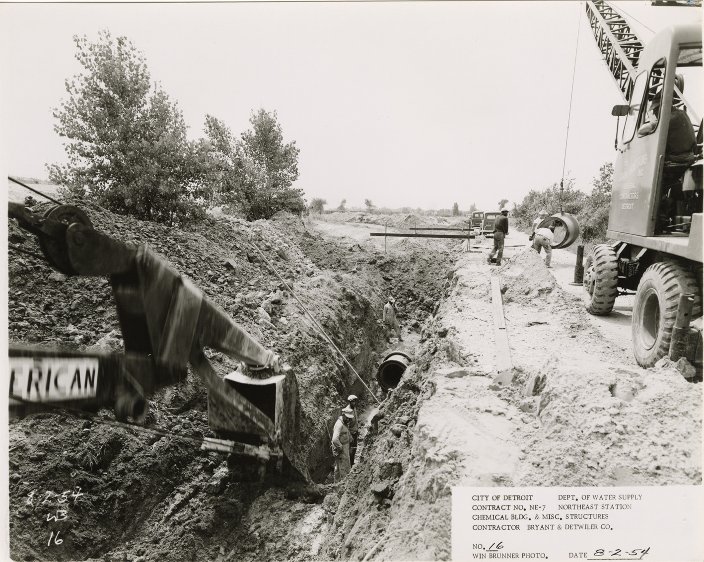 View of workers laying sewer pipe, Northeast Station, Detroit water supply system. Crane on roadside. Printed on front: "City of Detroit. Department of Water Supply. Contract no. NE-7. Northeast Station. Chemical Bldg. & misc. structures. Contractor Bryant & Detwiler Co. No. 16. Win Brunner photo. Date: 8-2-54." Typed on back: "No. 16. Laying 30" sewer, looking south from Sta. 19+00 S, at Sta. 0+65 E."