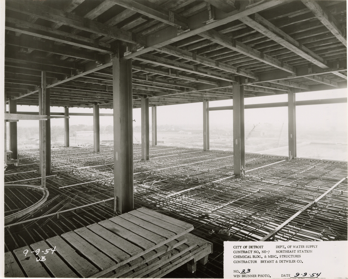 View of reinforcing bars and electrical conduits, Chemical Building during construction, Northeast Station, Detroit water supply system. Printed on front: "City of Detroit. Department of Water Supply. Contract no. NE-7. Northeast Station. Chemical Bldg. & misc. structures. Contractor Bryant & Detwiler Co. No. 23. Win Brunner photo. Date: 9-9-54." Typed on back: "No. 23. Reinforcing steel and electrical conduits in place for fourth floor pour, looking northeast. Columns A2, A3, A4, B1, B2, B3, B4, C1, C2, C3, C4."
