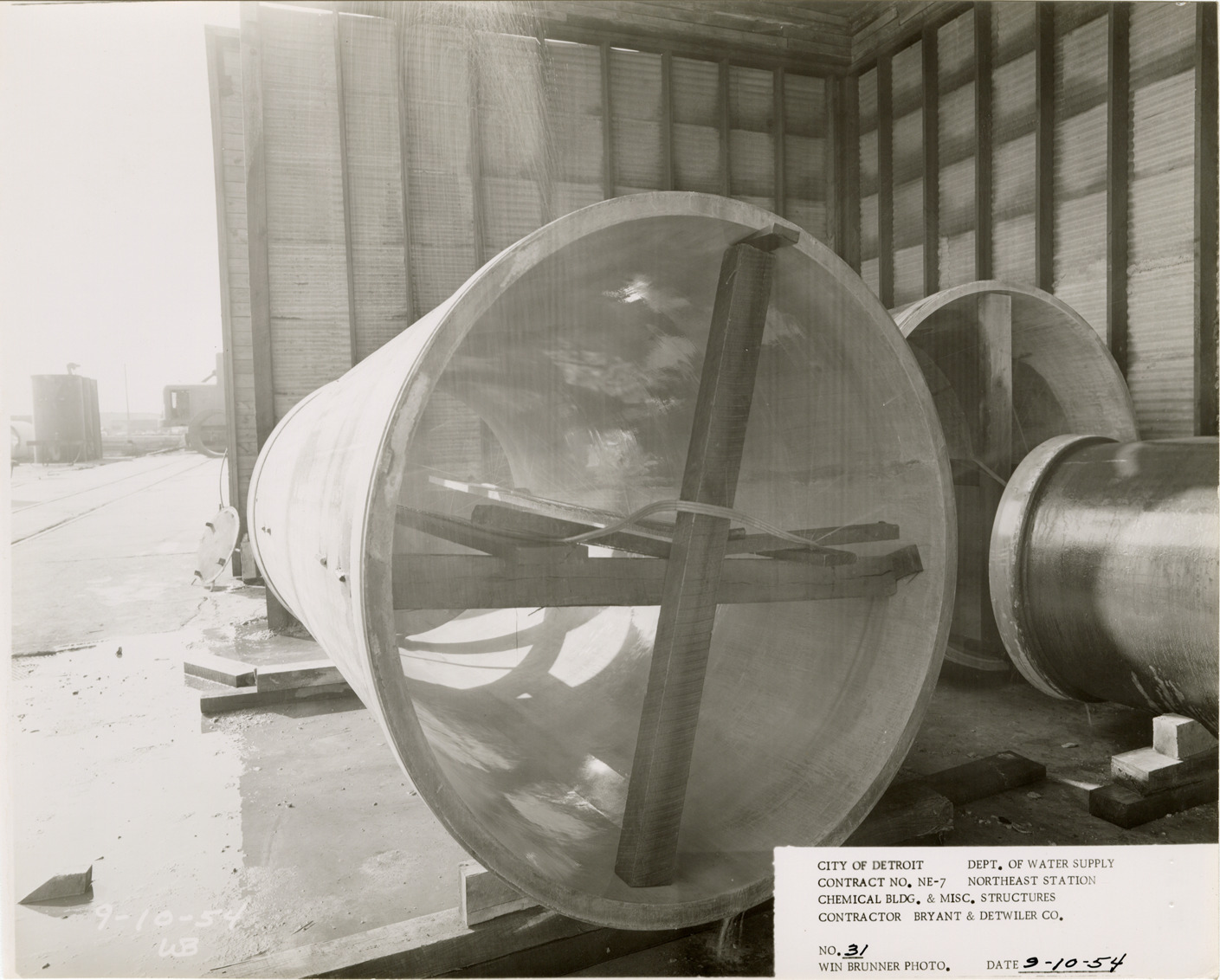 View of Venturi meter exit tube, Chemical Building during construction, Northeast Station, Detroit water supply system. Printed on front: "City of Detroit. Department of Water Supply. Contract no. NE-7. Northeast Station. Chemical Bldg. & misc. structures. Contractor Bryant & Detwiler Co. No. 31. Win Brunner photo. Date: 9-10-54." Typed on back: "No. 31. Section of Venturi Meter exit tube with lining being cured by water spray. Lock Joint Pipe Company."