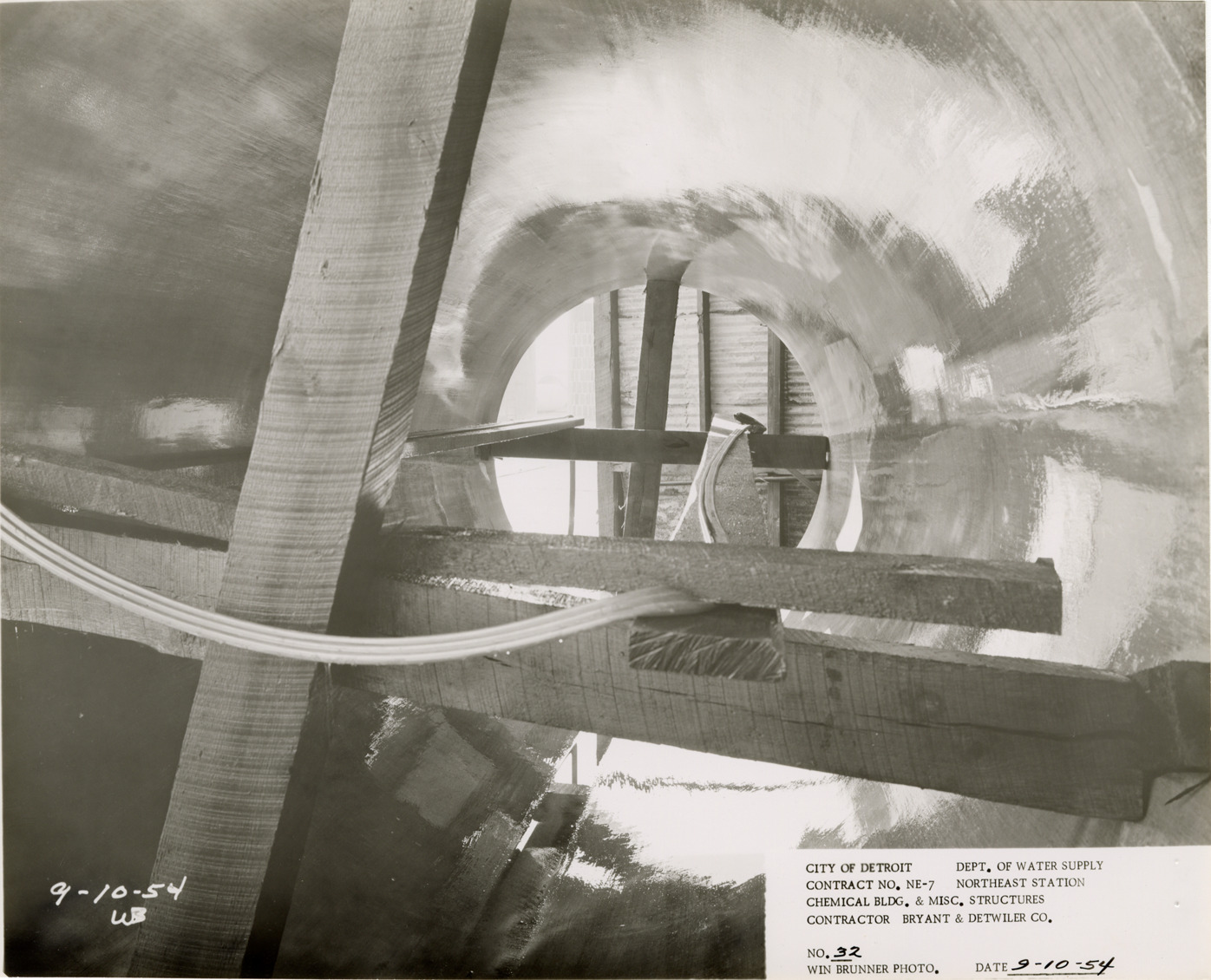 View of Venturi meter exit tube, Chemical Building during construction, Northeast Station, Detroit water supply system. Printed on front: "City of Detroit. Department of Water Supply. Contract no. NE-7. Northeast Station. Chemical Bldg. & misc. structures. Contractor Bryant & Detwiler Co. No. 32. Win Brunner photo. Date: 9-10-54." Typed on back: "No. 32. Finished section of Venturi Meter exit tube after curing. Lock Joint Pipe Company."