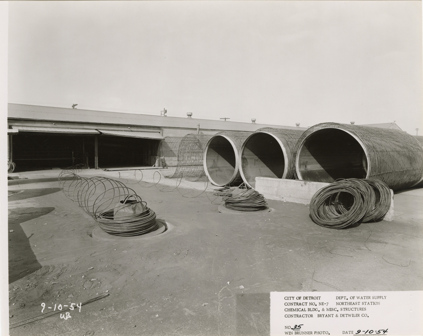 View of concrete pipes and steel cages, Chemical Building during construction, Northeast Station, Detroit water supply system. Printed on front: "City of Detroit. Department of Water Supply. Contract no. NE-7. Northeast Station. Chemical Bldg. & misc. structures. Contractor Bryant & Detwiler Co. No. 35. Win Brunner photo. Date: 9-10-54." Typed on back: "No. 35. 84" reinforced concrete pipe fabrication with 12 gage cylinder and reinforcing steel cages. Lock Joint Pipe Company."