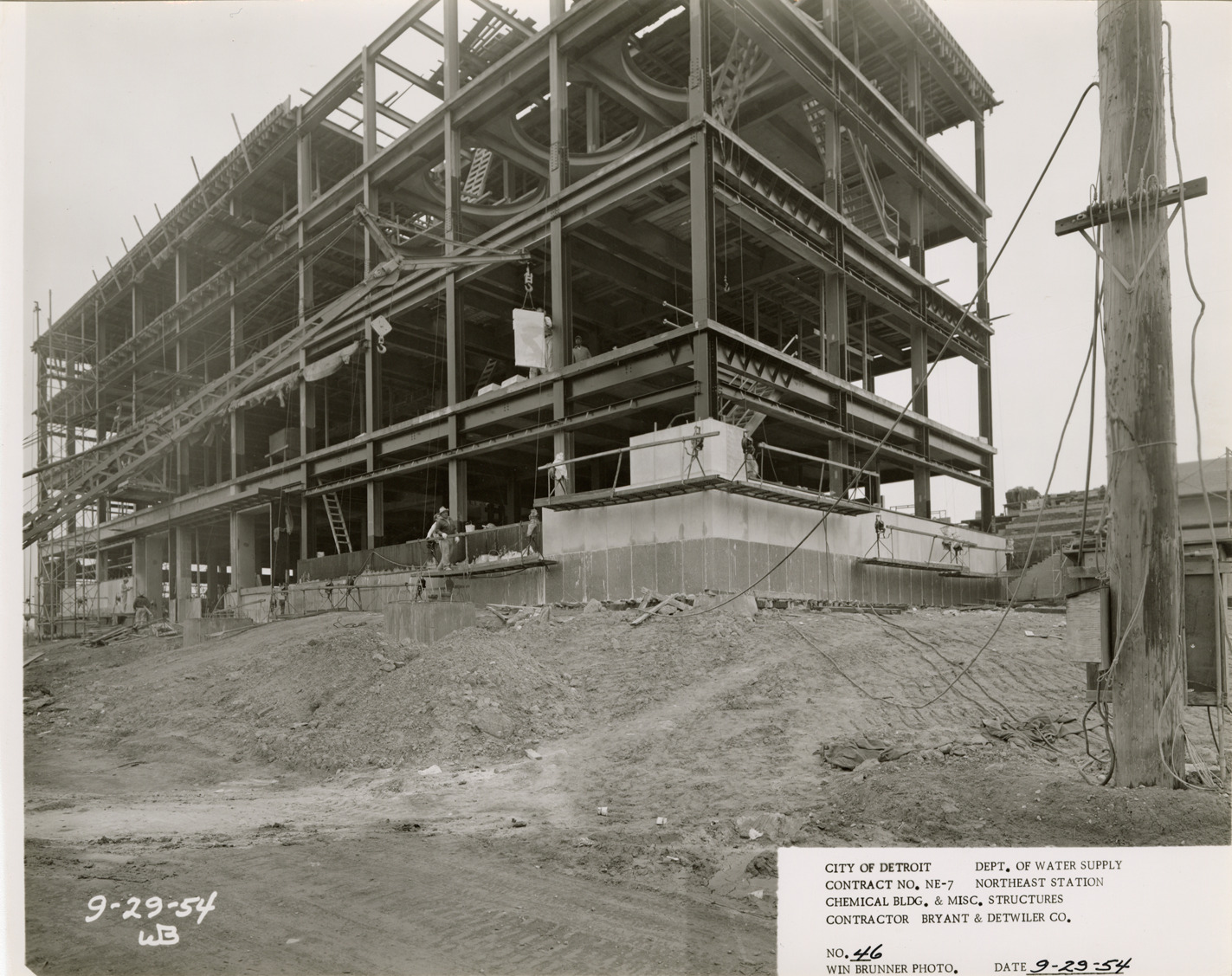 View of Chemical Building during construction, Northeast Station, Detroit water supply system. Printed on front: "City of Detroit. Department of Water Supply. Contract no. NE-7. Northeast Station. Chemical Bldg. & misc. structures. Contractor Bryant & Detwiler Co. No. 46. Win Brunner photo. Date: 9-29-54." Typed on back: "No. 46. Chemical Building, from southwest."