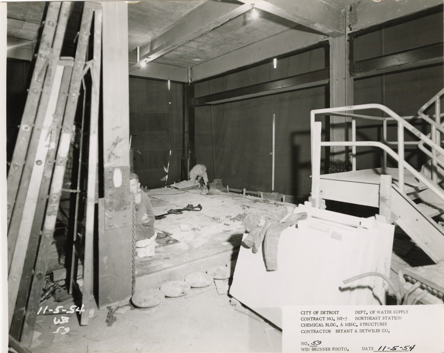 View of men laying brick on southeast corner of Chemical Building, Northeast Station, Detroit water supply system. Printed on front: "City of Detroit. Department of Water Supply. Contract no. NE-7. Northeast Station. Chemical Bldg. & misc. structures. Contractor Bryant & Detwiler Co. No. 59. Win Brunner photo. Date: 11-5-54." Typed on back: "No. 59. Laying backup brick at southeast corner of Chemical Building."