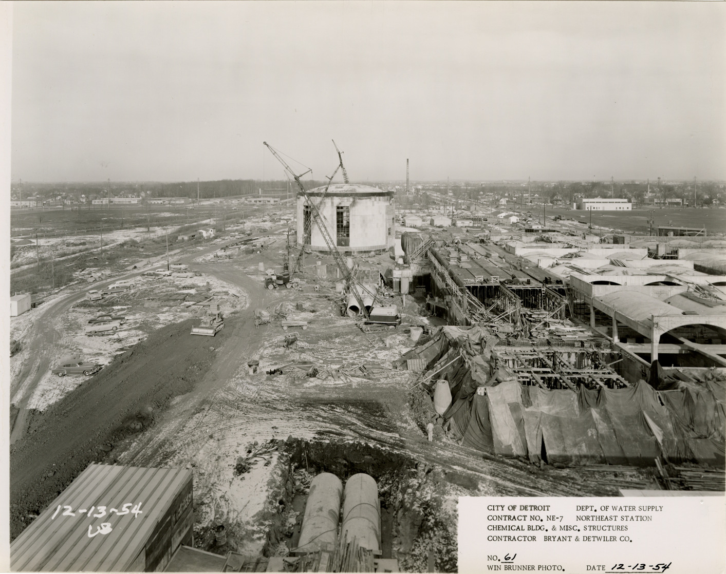 View of raw water conduits, Chemical Building during construction, Northeast Station, Detroit water supply system. Low lift plant in background. Printed on front: "City of Detroit. Department of Water Supply. Contract no. NE-7. Northeast Station. Chemical Bldg. & misc. structures. Contractor Bryant & Detwiler Co. No. 61. Win Brunner photo. Date: 12-13-54." Typed on back: "No. 61. Raw water conduits. Looking north from roof of Chemical Building. Low lift structure, damaged by fire, in background."