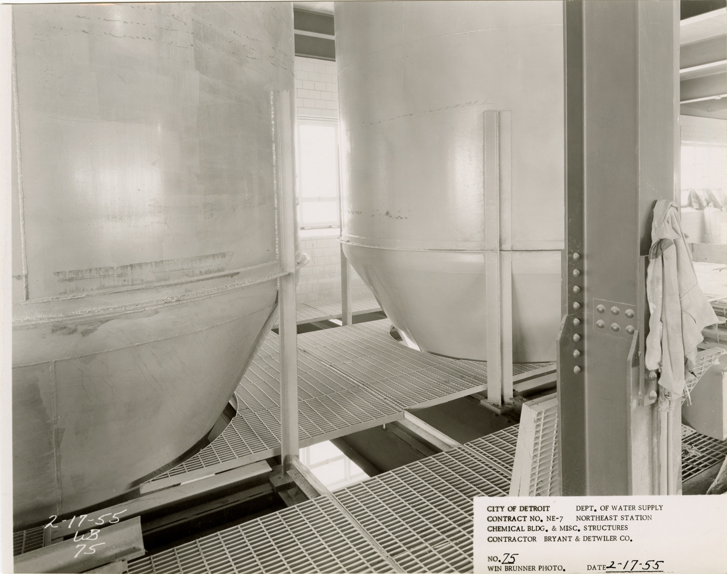 View of dry alum storage tanks, Chemical Building during construction, Northeast Station, Detroit water supply system. Printed on front: "City of Detroit. Department of Water Supply. Contract no. NE-7. Northeast Station. Chemical Bldg. & misc. structures. Contractor Bryant & Detwiler Co. No. 75. Win Brunner photo. Date: 2-17-55." Stamped on back: "Win Brunner, photographer. 2210 Park Avenue. Detroit 1, Mich. WO. 2-5500." Typed on back: "No. 75. Dry alum storage tanks, third floor, Chemical Building."