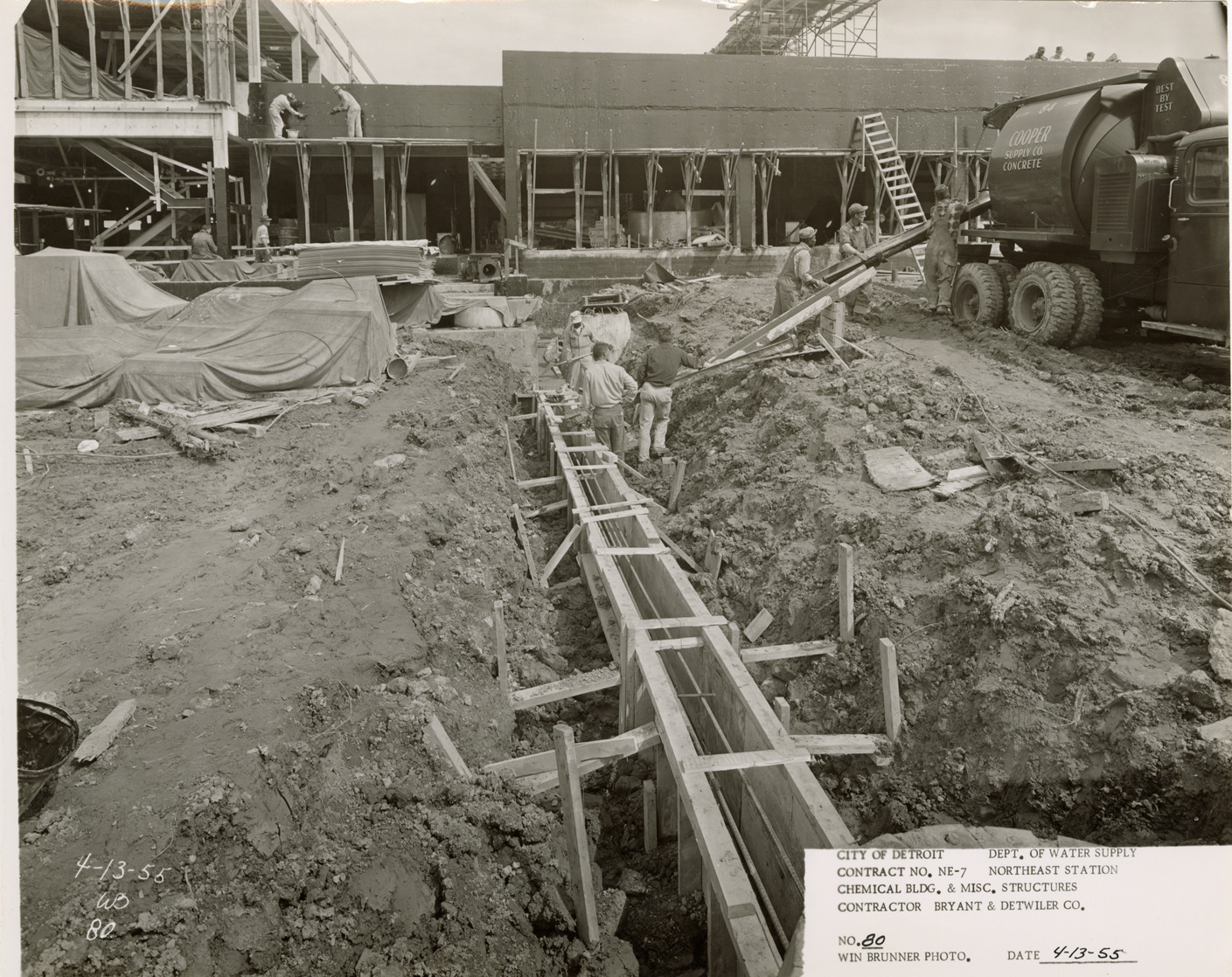 View of workers pouring concrete for pipe support beam, Chemical Building during construction, Northeast Station, Detroit water supply system. Printed on front: "City of Detroit. Department of Water Supply. Contract no. NE-7. Northeast Station. Chemical Bldg. & misc. structures. Contractor Bryant & Detwiler Co. No. 80. Win Brunner photo. Date: 4-13-55." Stamped on back: "Win Brunner, photographer. 2210 Park Avenue. Detroit 1, Mich. WO. 2-5500." Typed on back: "No. 80. Pouring pipe support beam from office building to M.H. D-4."