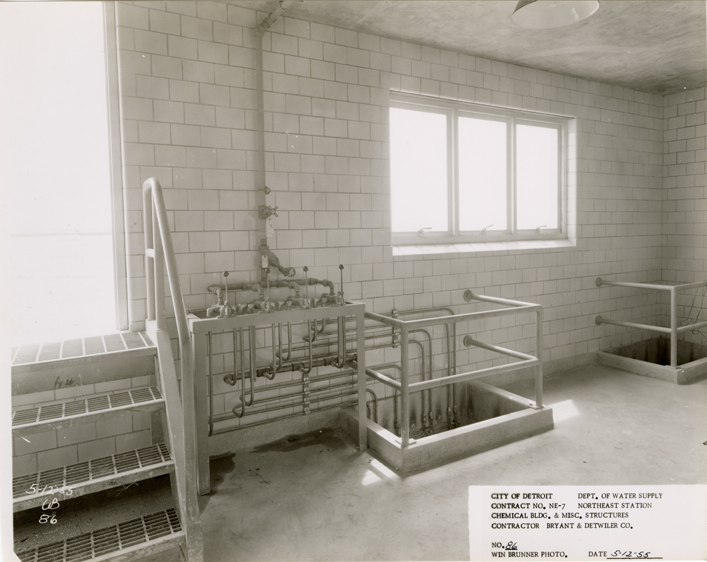 View of hydraulic controls for mud valves, Chemical Building during construction, Northeast Station, Detroit water supply system. Printed on front: "City of Detroit. Department of Water Supply. Contract no. NE-7. Northeast Station. Chemical Bldg. & misc. structures. Contractor Bryant & Detwiler Co. No. 86. Win Brunner photo. Date: 5-12-55." Stamped on back: "Win Brunner, photographer. 2210 Park Avenue. Detroit 1, Mich. WO. 2-5500." Typed on back: "No. 86. Hydraulic controls for mud valves in basin no. 4."