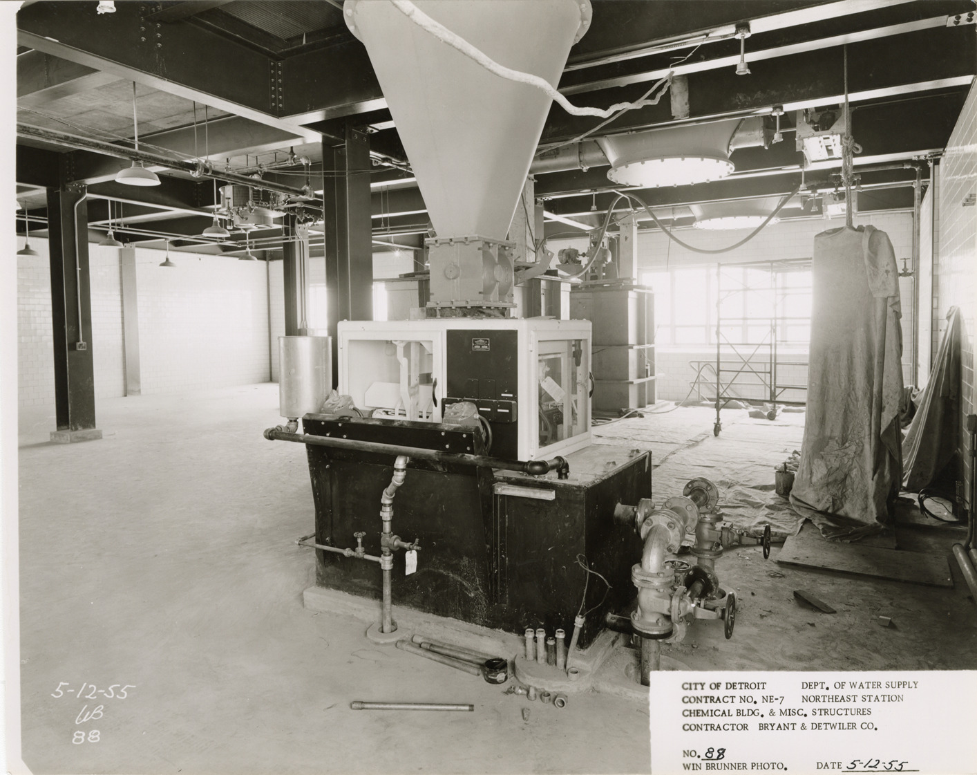 View of dry alum feeder, Chemical Building during construction, Northeast Station, Detroit water supply system. Printed on front: "City of Detroit. Department of Water Supply. Contract no. NE-7. Northeast Station. Chemical Bldg. & misc. structures. Contractor Bryant & Detwiler Co. No. 88. Win Brunner photo. Date: 5-12-55." Stamped on back: "Win Brunner, photographer. 2210 Park Avenue. Detroit 1, Mich. WO. 2-5500." Typed on back: "No. 88. Dry alum feeder showing feed and drain piping."