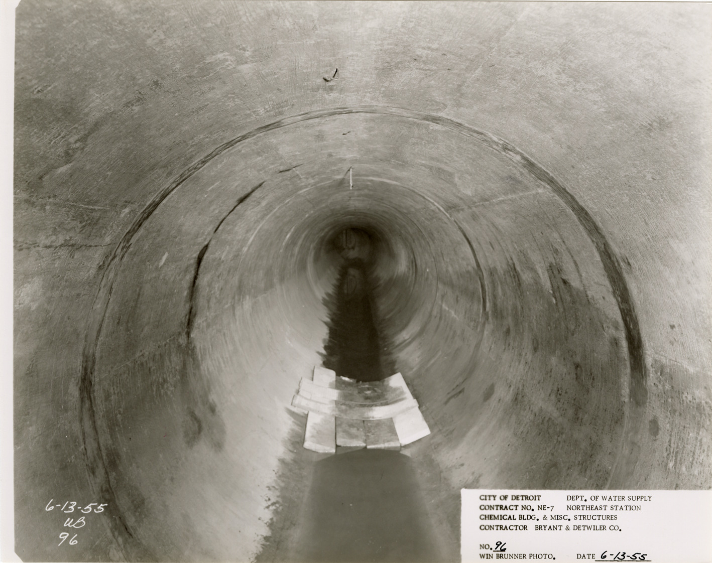 View of raw water conduit, Chemical Building during construction, Northeast Station, Detroit water supply system. Printed on front: "City of Detroit. Department of Water Supply. Contract no. NE-7. Northeast Station. Chemical Bldg. & misc. structures. Contractor Bryant & Detwiler Co. No. 96. Win Brunner photo. Date: 6-13-55." Stamped on back: "Win Brunner, photographer. 2210 Park Avenue. Detroit 1, Mich. WO. 2-5500." Typed on back: "No. 96. 84" raw water conduit at 36" diameter by pass."
