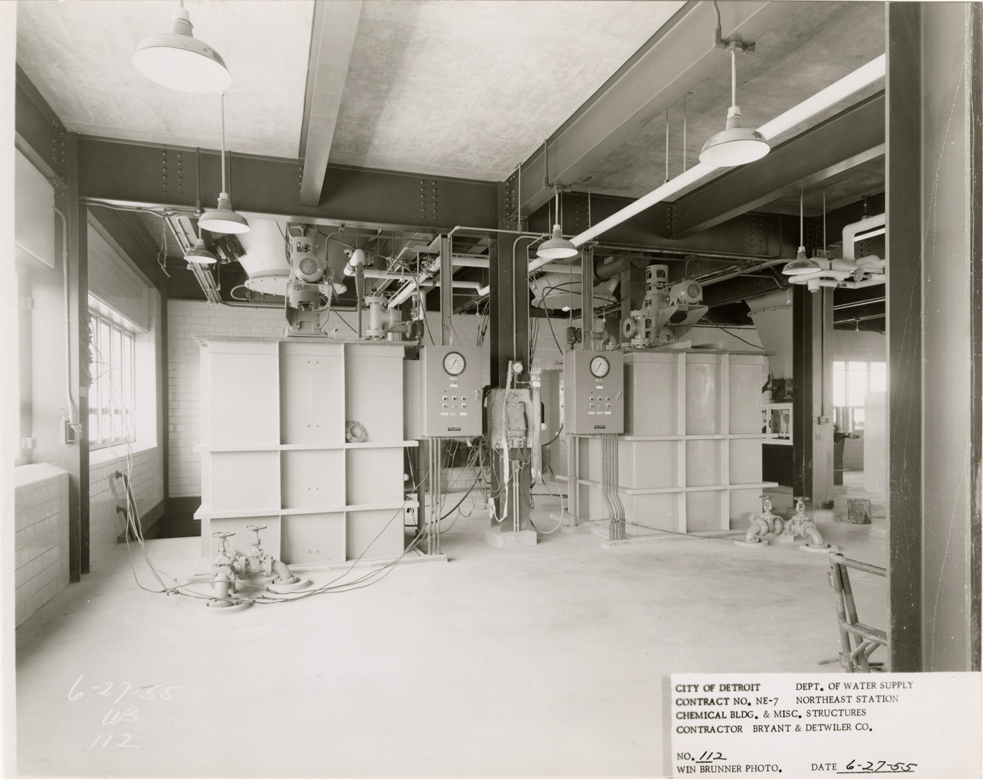 View of alum tanks and control panels, Chemical Building during construction, Northeast Station, Detroit water supply system. Printed on front: "City of Detroit. Department of Water Supply. Contract no. NE-7. Northeast Station. Chemical Bldg. & misc. structures. Contractor Bryant & Detwiler Co. No. 112. Win Brunner photo. Date: 6-27-55." Stamped on back: "Win Brunner, photographer. 2210 Park Avenue. Detroit 1, Mich. WO. 2-5500." Typed on back: "No. 112. Alum batching tanks and control panels no. 3 and no. 4."