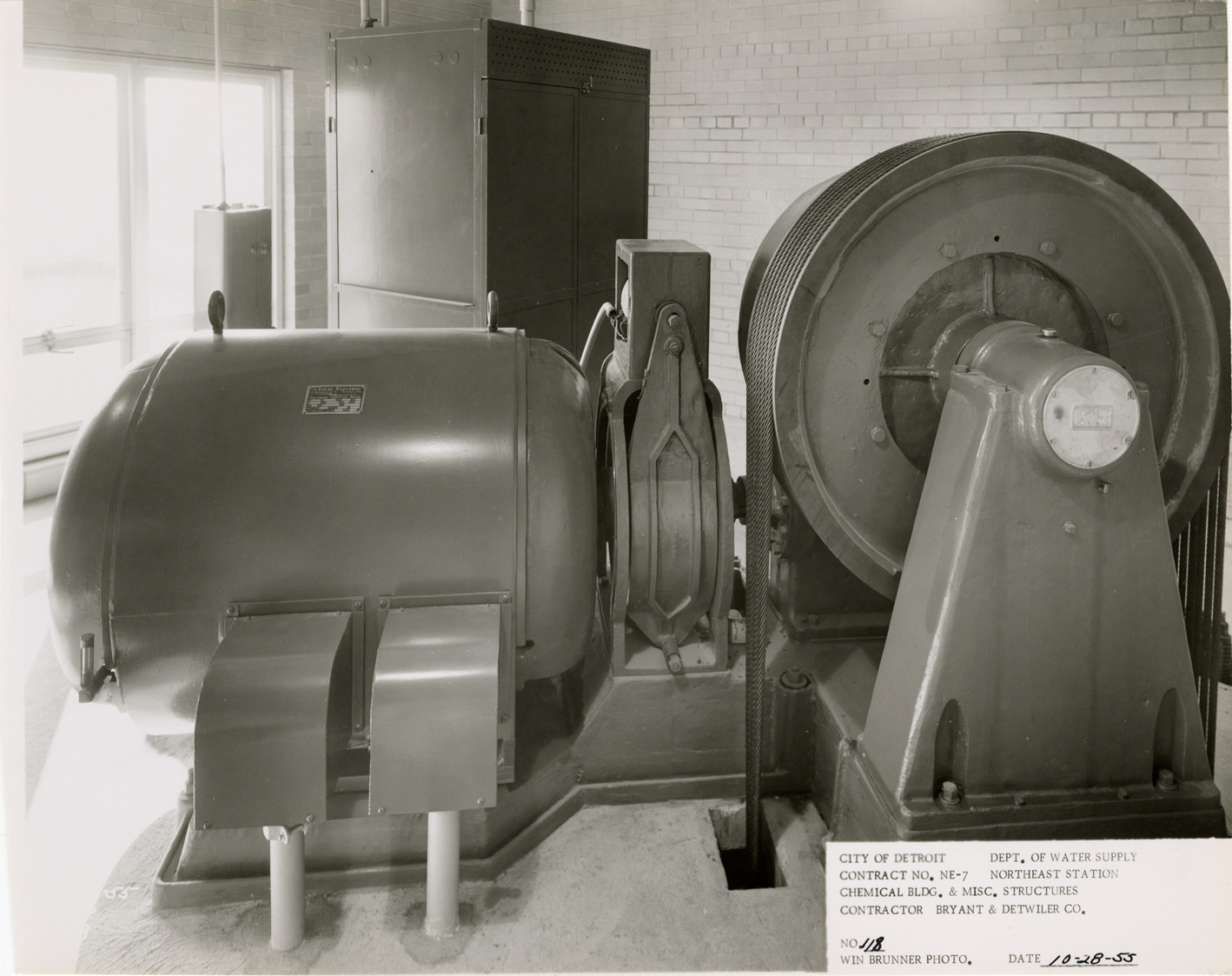 View of elevator equipment, Chemical Building during construction, Northeast Station, Detroit water supply system. Printed on front: "City of Detroit. Department of Water Supply. Contract no. NE-7. Northeast Station. Chemical Bldg. & misc. structures. Contractor Bryant & Detwiler Co. No. 118. Win Brunner photo. Date: 10-28-55." Stamped on back: "Win Brunner, photographer. 2210 Park Avenue. Detroit 1, Mich. WO. 2-5500." Typed on back: "No. 118. Elevator equipment in penthouse."