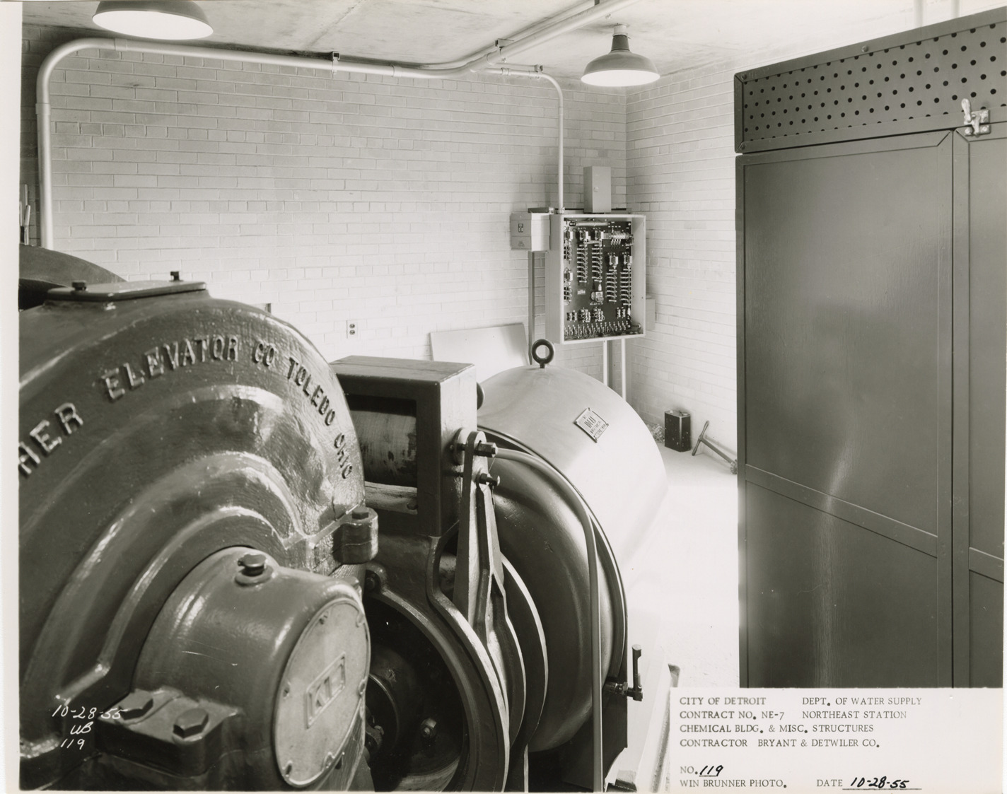 View of elevator equipment, Chemical Building during construction, Northeast Station, Detroit water supply system. Printed on front: "City of Detroit. Department of Water Supply. Contract no. NE-7. Northeast Station. Chemical Bldg. & misc. structures. Contractor Bryant & Detwiler Co. No. 119. Win Brunner photo. Date: 10-28-55." Stamped on back: "Win Brunner, photographer. 2210 Park Avenue. Detroit 1, Mich. WO. 2-5500." Typed on back: "No. 119. Elevator equipment in penthouse."