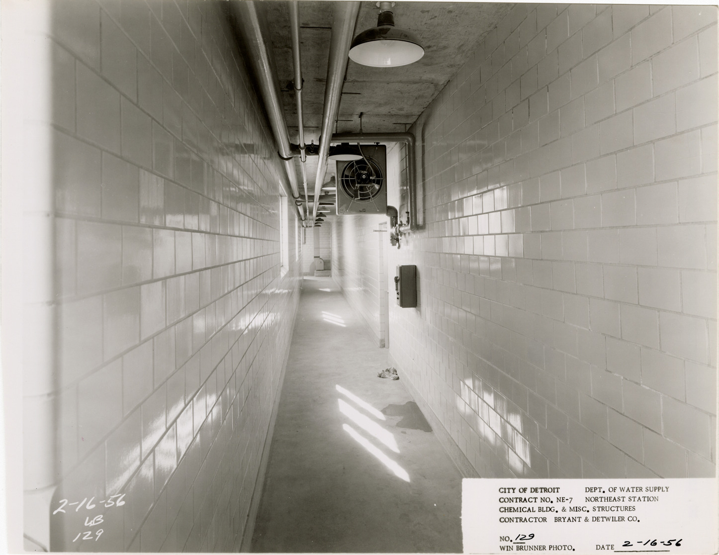 View of corridor over settling basins, Chemical Building during construction, Northeast Station, Detroit water supply system. Printed on front: "City of Detroit. Department of Water Supply. Contract no. NE-7. Northeast Station. Chemical Bldg. & misc. structures. Contractor Bryant & Detwiler Co. No. 129. Win Brunner photo. Date: 2-16-56." Typed on back: "No. 129. Corridor over settling basins to south gallery, looking south."