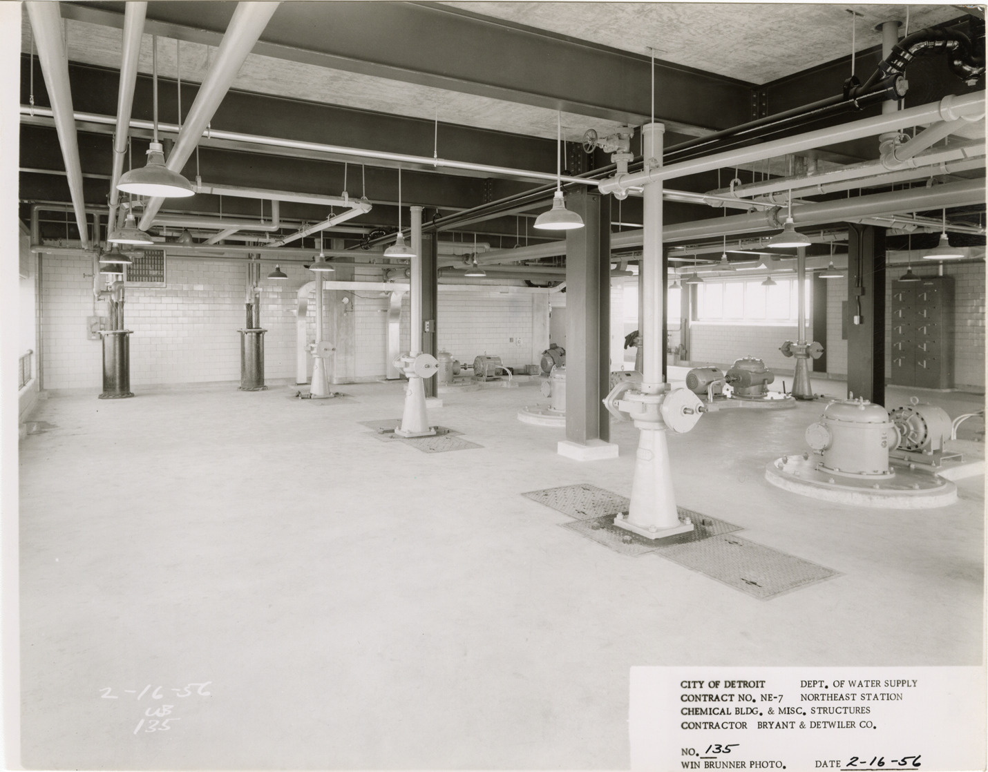 View of rapid mix drive unit room, Chemical Building during construction, Northeast Station, Detroit water supply system. Printed on front: "City of Detroit. Department of Water Supply. Contract no. NE-7. Northeast Station. Chemical Bldg. & misc. structures. Contractor Bryant & Detwiler Co. No. 135. Win Brunner photo. Date: 2-16-56." Typed on back: "No. 135. First floor rapid mix drive unit room, looking northeast."